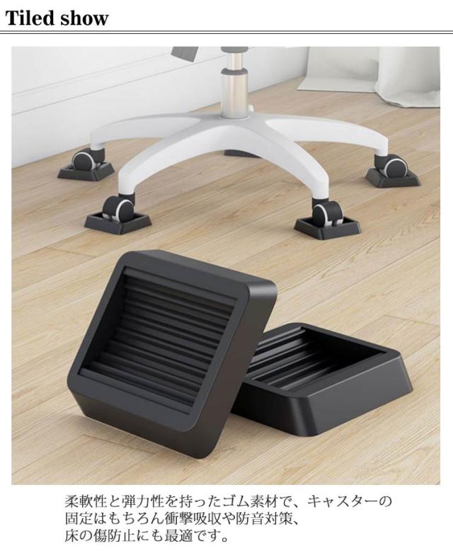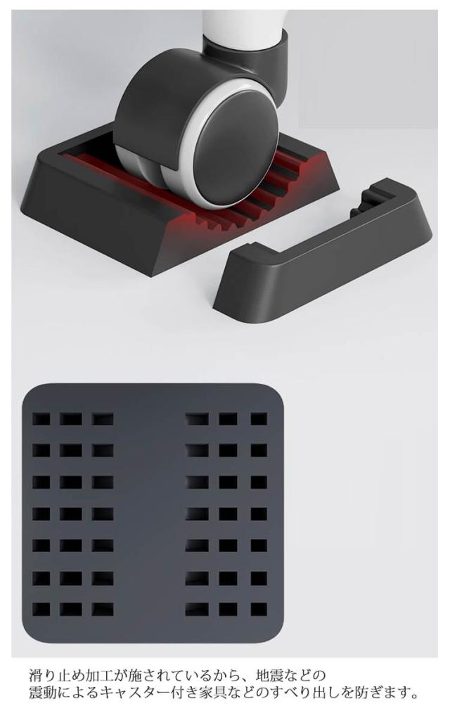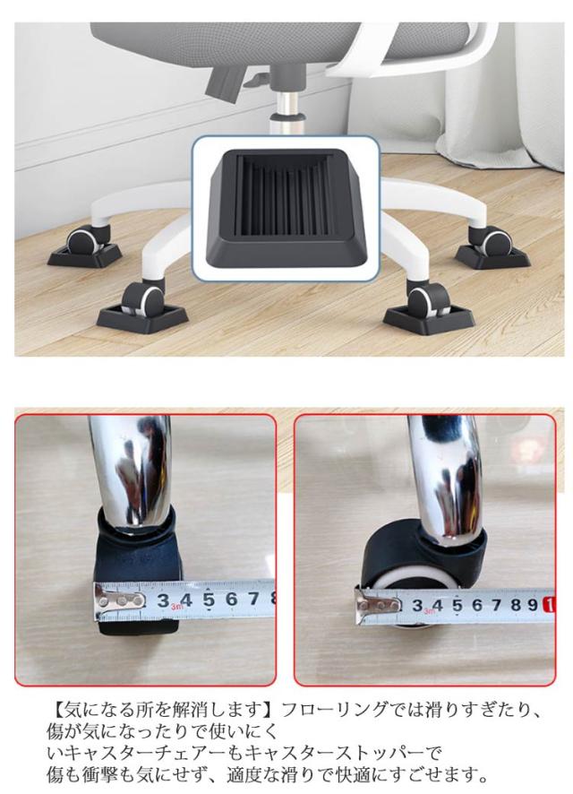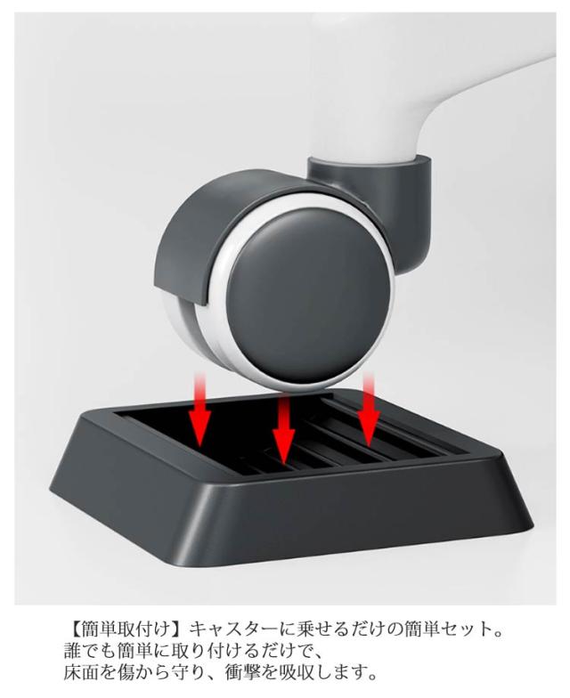 | 【衝撃吸収・防音・床傷防止】柔軟性と弾力性を持ったゴム素材で、キャスターの固定はもちろん衝撃吸収や防音対策、床の傷防止にも最適です。 【滑り止め・地震対策】滑り止め加工が施されているから、地震などの震動によるキャスター付き家具などのすべり出しを防ぎます。 【気になる所を解消します】フローリングでは滑りすぎたり、傷が気になったりで使いにくいキャスターチェアーもキャスターストッパーで傷も衝撃も気にせず、適度な滑りで快適にすごせます。 【簡単取付け】キャスターに乗せるだけの簡単セット。誰でも簡単に取り付けるだけで、床面を傷から守り、衝撃を吸収します。 【馴染むシンプルデザイン】オフィスチェアーにも馴染むようにシンプルデザイン。オフィスチェアキャスター以外の家具や冷蔵庫などの脚にもご使用になれます。 | |