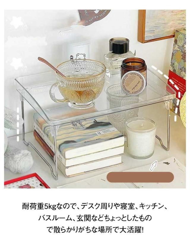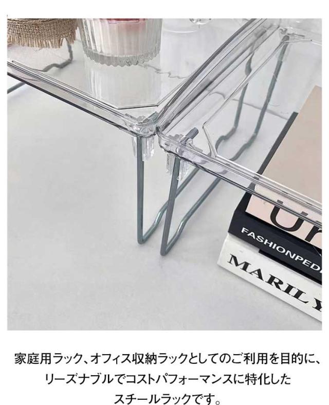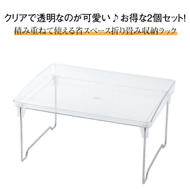 | クリアで透明なのが可愛い♪お得な2個セット!積み重ねて使える省スペース折り畳み収納ラック クリアでシンプルなデザインラック自体が透明なので、お部屋に圧迫感を与えず、インテリアの邪魔もしない。 耐荷重5kgなので、デスク周りや寝室、キッチン、バスルーム、玄関などちょっとしたもので散らかりがちな場所で大活躍! 家庭用ラック、オフィス収納ラックとしてのご利用を目的に、リーズナブルでコストパフォーマンスに特化したスチールラックです。 | |