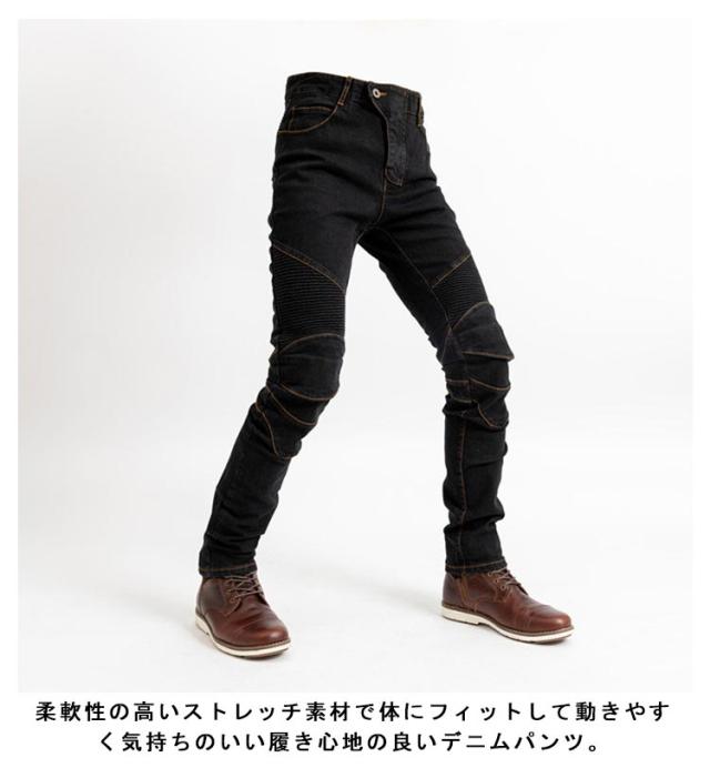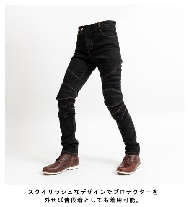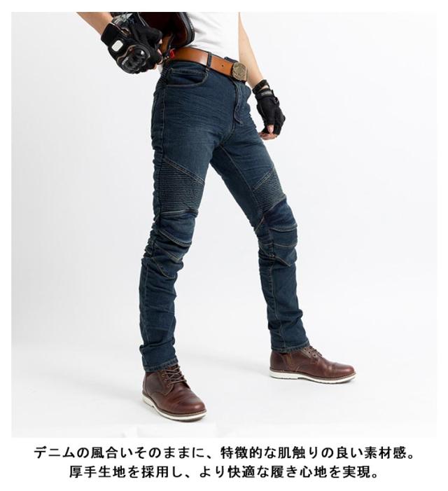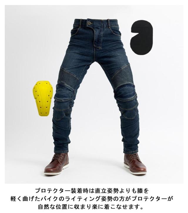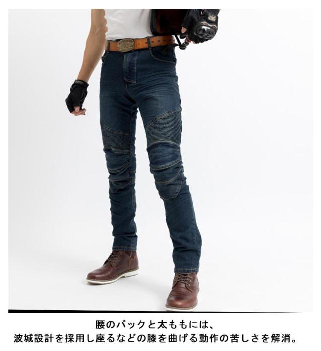 | 柔軟性の高いストレッチ素材で体にフィットして動きやすく気持ちのいい履き心地の良いデニムパンツ。 スタイリッシュなデザインでプロテクターを外せば普段着としても着用可能。 着用時は細く見えるシルエットで、体にフィットするスリム設計デザイン。 プロテクター装着時は直立姿勢よりも膝を軽く曲げたバイクのライティング姿勢の方がプロテクターが自然な位置に収まり楽に着こなせます。 伸縮性が高く、よく伸びる生地で着やすい素材を採用。 腰のバックと太ももには、波城設計を採用し座るなどの膝を曲げる動作の苦しさを解消。 デニムの風合いそのままに、特徴的な肌触りの良い素材感。 厚手生地を採用し、より快適な履き心地を実現。 | |