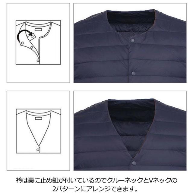 | 毎年人気のインナーダウンジャケット!クルーネックとVネックの2パターンにアレンジ可能!【S-3XL】 衿は裏に止め釦が付いているのでクルーネックとVネックの2パターンにアレンジできます。 インナーを選ばないノーカラーで着回し力も高め。 ジャケットやコートの下にも着用できるコンパクトなシルエットが特徴。 サイドにポケットが付いているのも嬉しいポイントです。 羽毛はとても軽く、反発力に優れたダウンを使用。 表地は撥水加工を施した高密度のナイロンを使用しているため、水に強く汚れも付きにくい仕様に。 カジュアルなコーデだけでなく、通勤などのビジネスシーンにも活躍するアイテムです。 | |