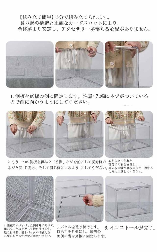 | 【クリアな全面扉】透明な材質で観賞用としてもお使いいただけます。 【スタッキングで省スペース】ボックス同士を積み重ねて縦に収納することで、狭いスペースでもしっかり収納できます。 【大容量】大きなサイズもハイカットも余裕で収納! 【雑貨や小物入れにも♪】靴の収納以外にもお使いいただけます。コレクションボックスとして最適です。クリアな素材なので衣類や雑貨など、中身が一目で分かるので使いやすいです。 【スタイリッシュな外観デザイン】透明感抜群の高品質アクリル素材を一体成型と超音波接合で組み上げた高級アクリル製オーガナイザー。中に入れたものを一目で確認できるのでディスプレイケースとしても使用可能です。 【多機能】透明のデザインで、ケースだけではなく、かばん、本、おもちゃ、靴などが収納できます。 【多目的収納】CD収納ボックス、ゲームディスクボックス収納ボックス、本/小さなコミック収納、キャラクター人形収納ディスプレイ、モデル収納ディスプレイとして使用できます。 スタッキング可能で省スペース。 大きな収納スペースでコレクションを整頓し、手の届きやすい場所に保管できます。 【組み立て簡単】5分で組み立てられます。 長方形の構造と正確なカードスロットにより、全体がより安定し、アクセサリーが落ちる心配がありません。 1.側板を底板の側に固定します。 注意:先端にネジがついているので前に向かうようにしてください。 2.もう一つの側板を組み立てる際、ネジを前にして反対側のネジと同 じ高さ、そして同じ側にいるよう にしてください。 3.組み立てられた部分に天板を固定し、釘の板の満が裏板の頂と一致するように注意してください。 4.裏板のすべすべした側を外に向けて,組み立てた板を押して締め付けます。取り付け際、溝とパックルは揃える必要がありますのでご注意ください。 5.パネルを取り付けます。持ち手を外側にし、底部の両側の溝を底板に固定します。 6.インストールが完了。 | |