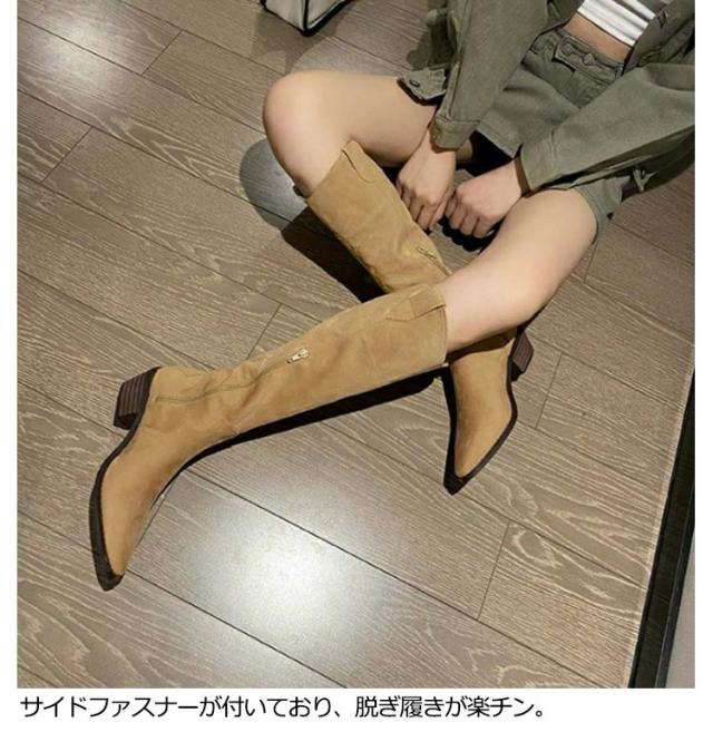 ロングブーツ ニーハイブーツ 美脚 ブーツ ローヒール スエード ポインテッドトゥ ウエスタン調 楽チン 大きいサイズ 痛くない スムース 細見せ 秋冬 疲れにくい カジュアル 送料無料
