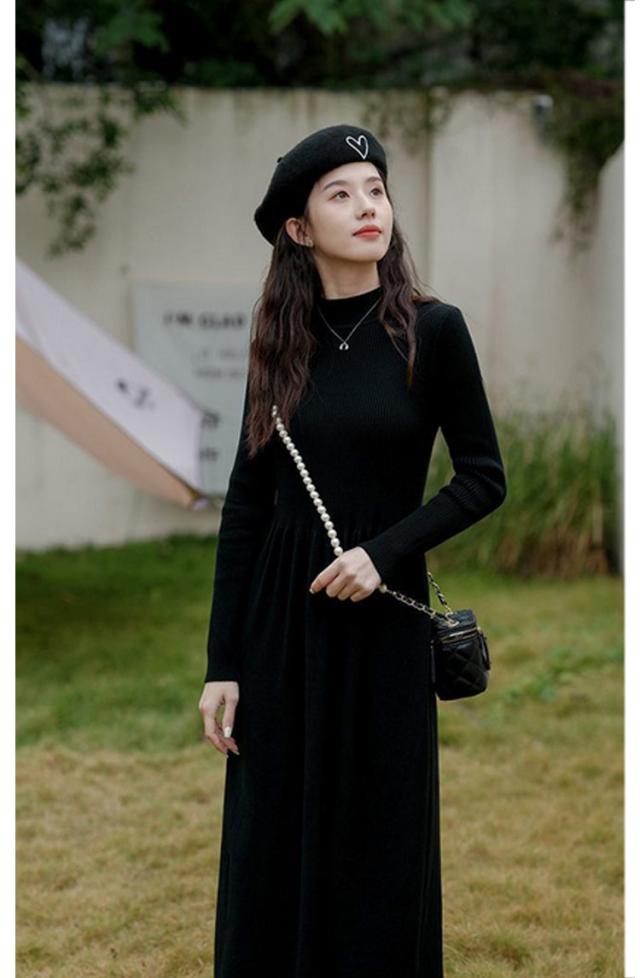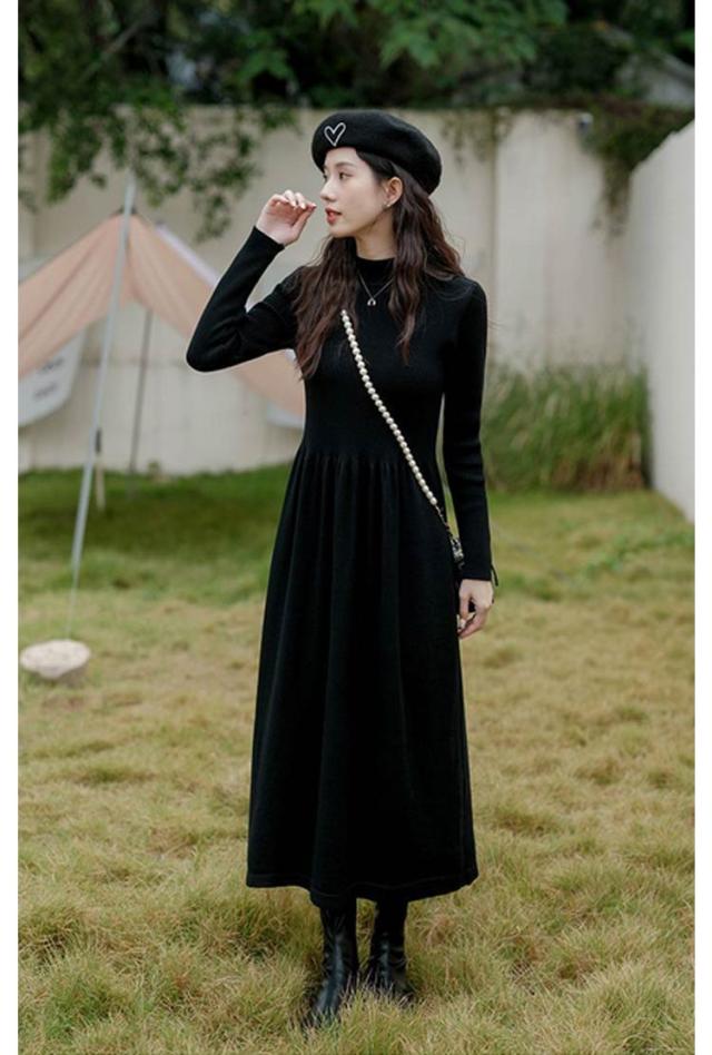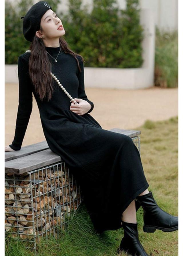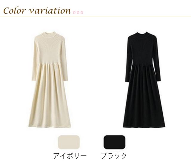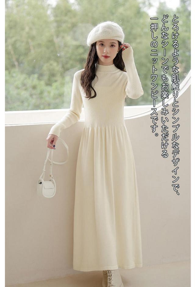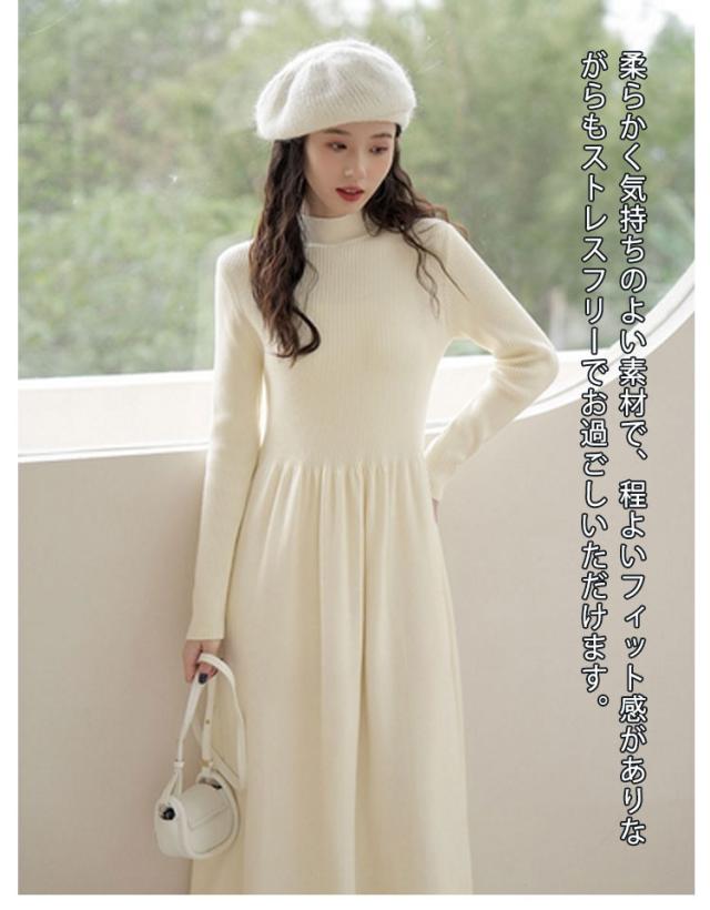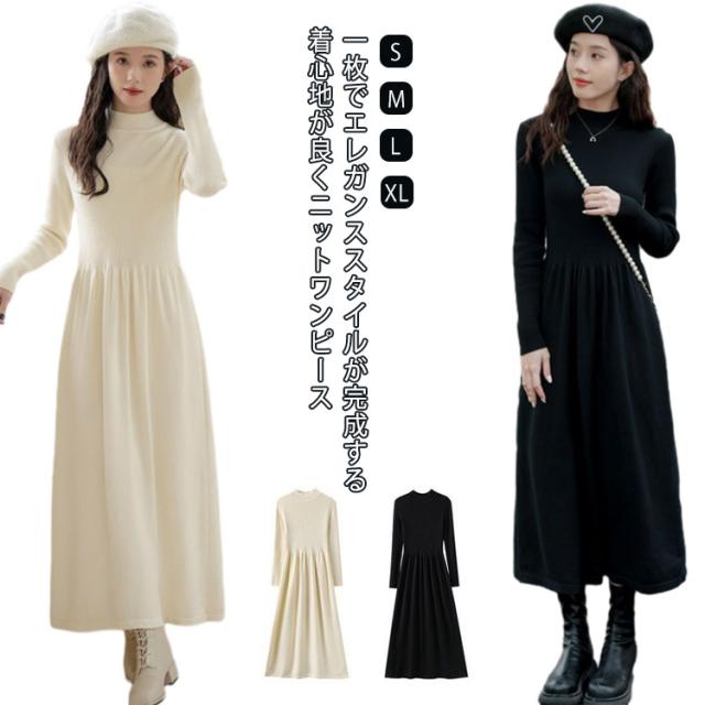 リブニット ワンピース レディース ニットワンピース ハイネック ハーフネック ロング丈 フレアワンピース 長袖 マキシワンピース ロングワンピース きれいめ カジュアル エレガント 上品 シンプル 春 秋 冬 無地 送料無料