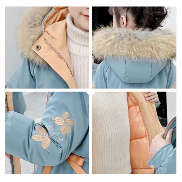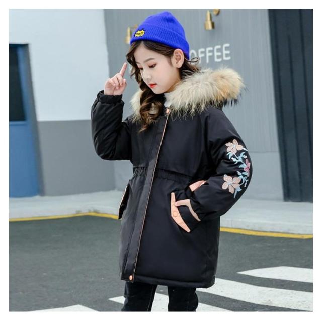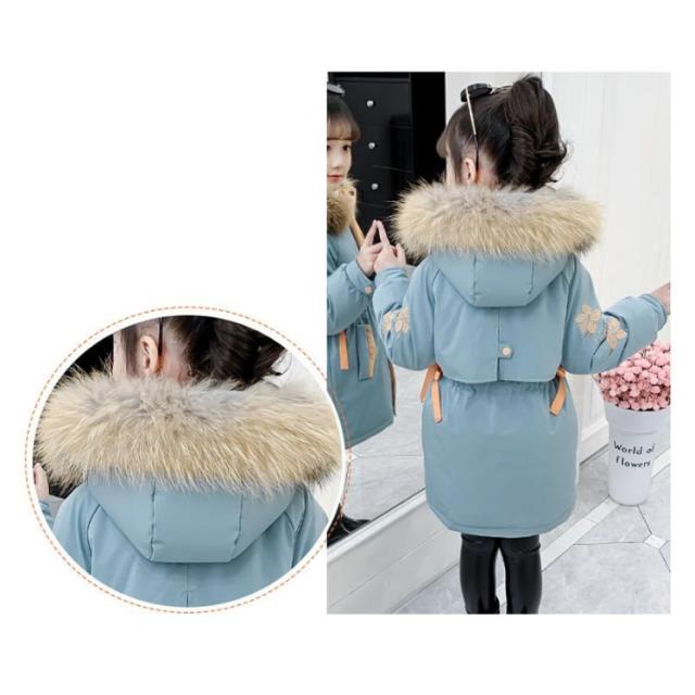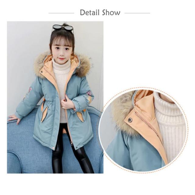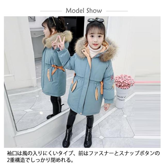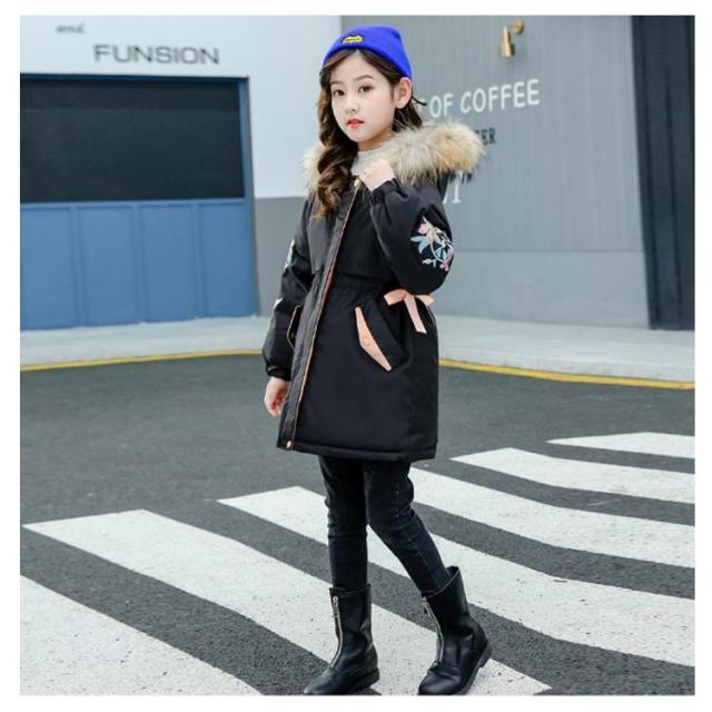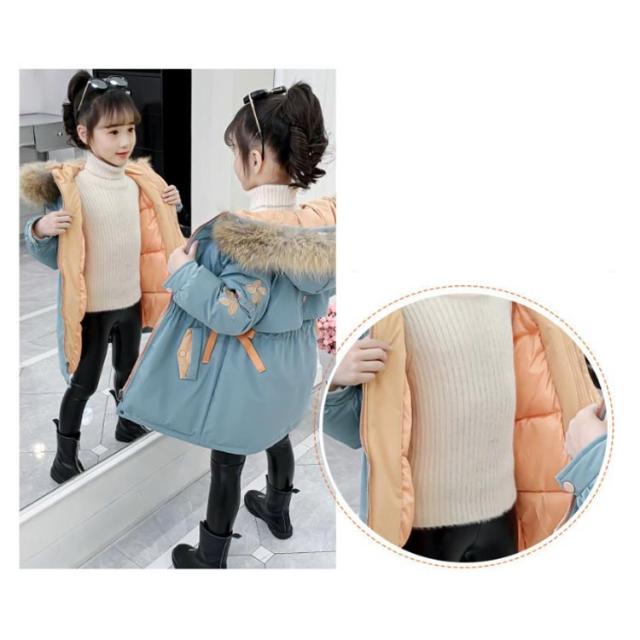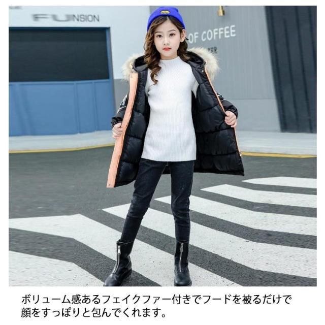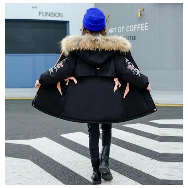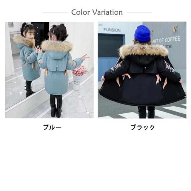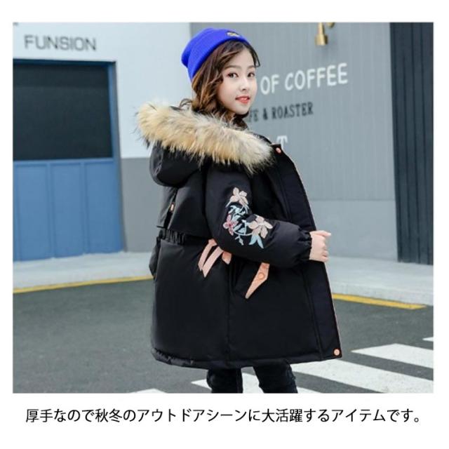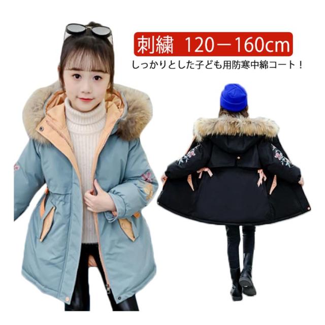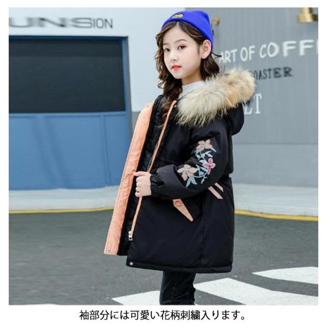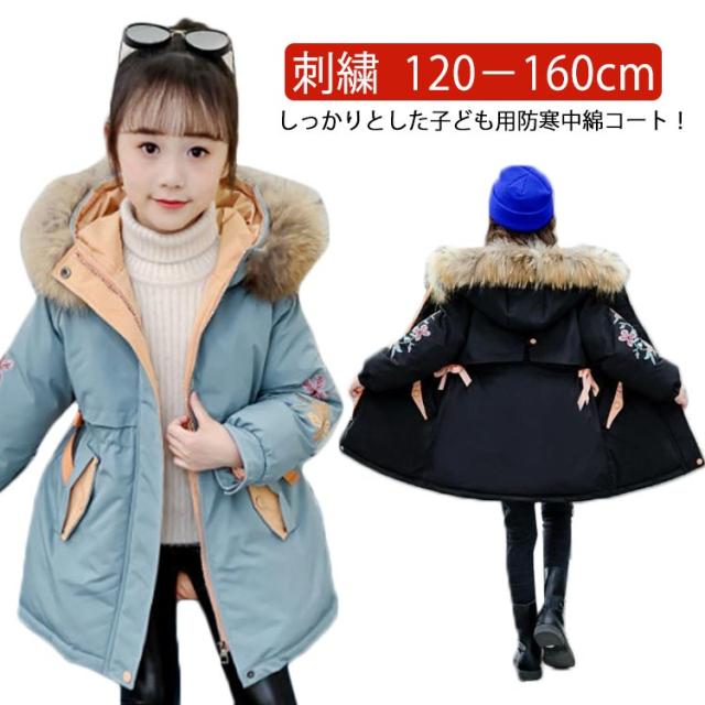 中綿 ジャケット 秋冬 子供 コート 綿 子供服 中綿コート ロング丈 キッズ アウター フェイクファー フード付き ロングコート 刺繍 ガールズ 暖かい 120−160cm ファー取り出し可能