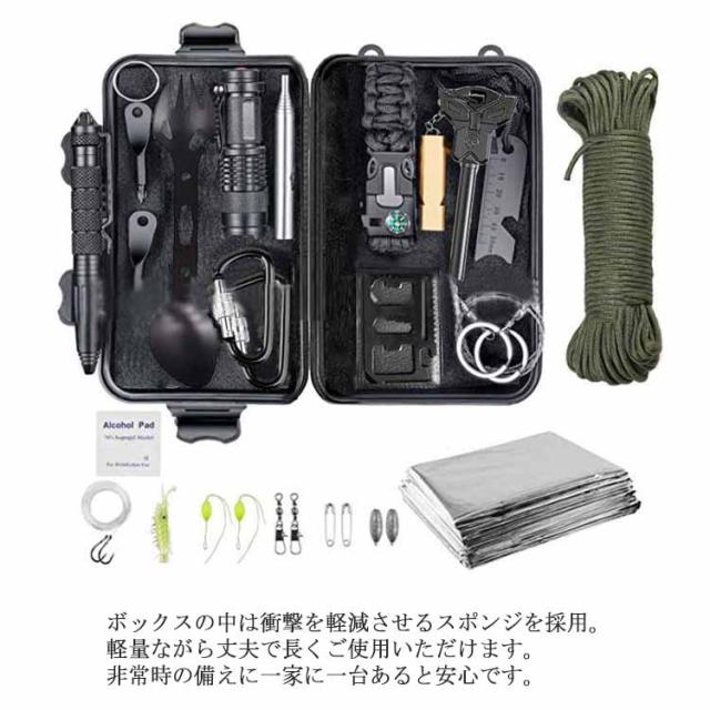| サイズについての説明 | サイズ:約20*11.7*6.9cm 商品内容:収納ボックス/折りたたみナイフ/多機能スプーン/タクティカルペン/多機能カード/火打石&スケール/ドライバー/LEDハンドライト(電池は別売り)/ボトルクリップ/サバイバルブレスレット/カラビナ×2/救助笛/ワイヤーソー/薬入れ/火吹き棒/サバイバルシート。 ※サイズ計測には誤差が生じます。 |