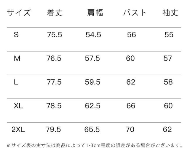 | サイズについての説明 | サイズ 着丈 肩幅 バスト 袖丈 ※サイズ表の実寸法は商品によって1-3cm程度の誤差がある場合がございます。 |