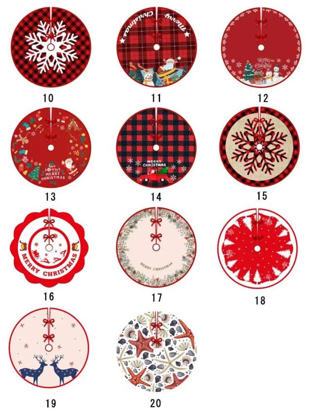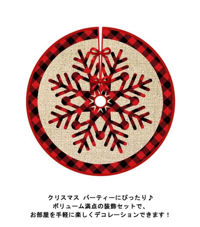 | クリスマスツリーの足元にかけるかわいいツリースカートです。 お手持ちのツリーの根本にかけるだけでより一層華やかに見えますよ。 クリスマスツリーの足元をグルッと囲んで、紐で留めるだけで簡単に設置できます。 クリスマスツリーの土台部分・コードなどが隠せるツリースカートは、全体がより華やかになるオシャレな装飾アイテムです。 クリスマス パーティーにぴったり♪ボリューム満点の装飾セットで、お部屋を手軽に楽しくデコレーションできます! ご家庭用はもちろん、お店や施設などのディスプレイ用にもオススメです。 | |