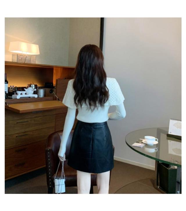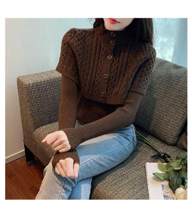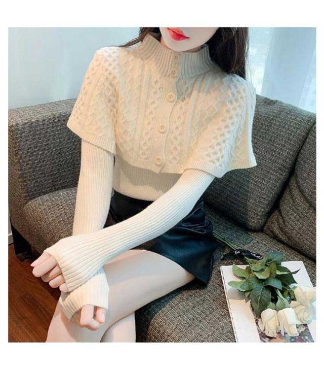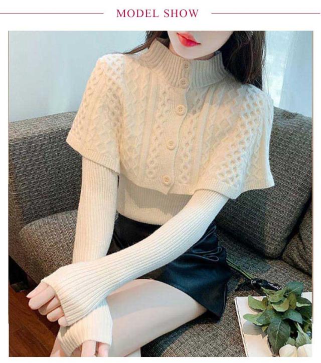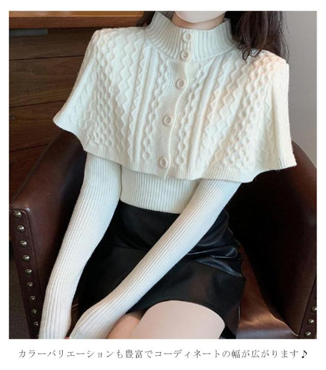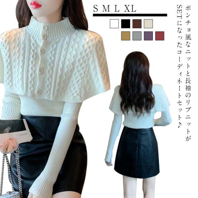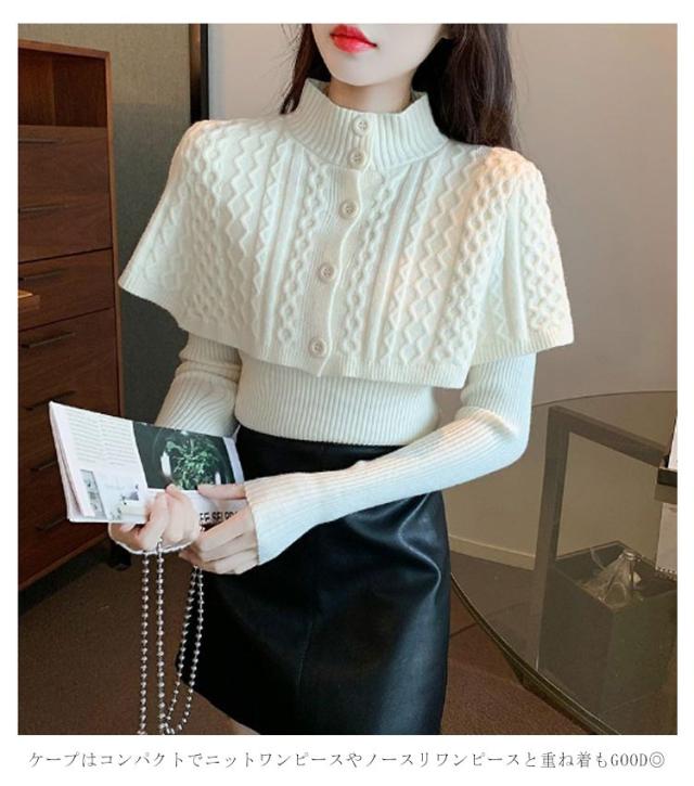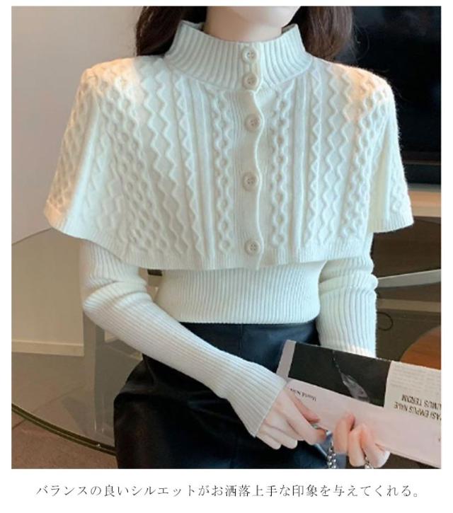 ニットポンチョ×長袖ニット ケープニット トップス ニット Vネック 長袖 ケープ付 プルオーバー マント ケープ ボタン 無地 重ね着 2点セット フェミニン お出かけ 着回し レイヤード 秋 冬 送料無料 デイリーファッション 普段着 おしゃれ