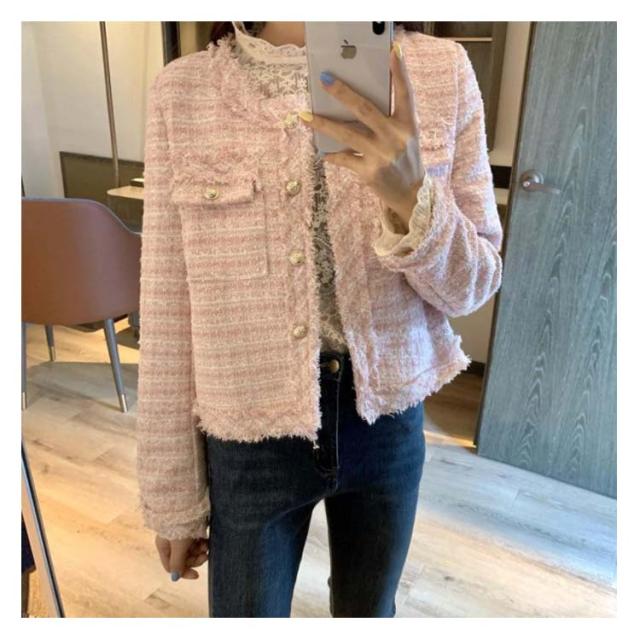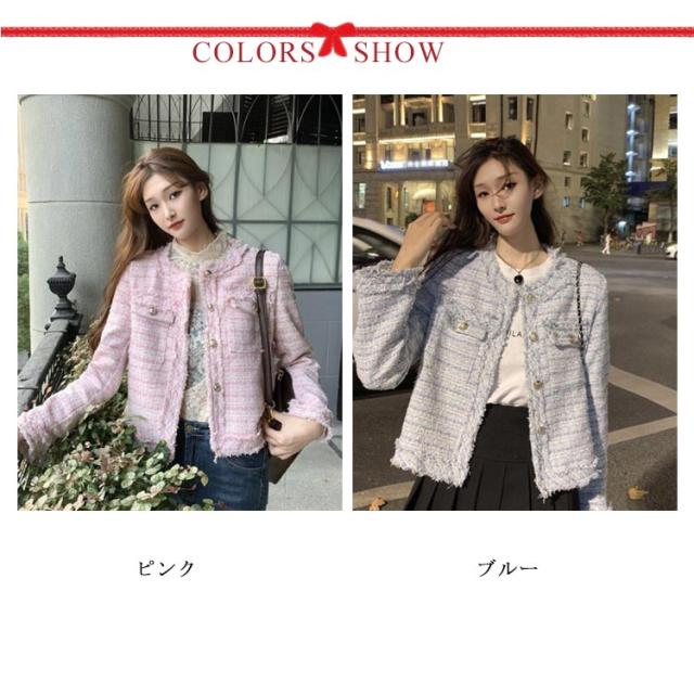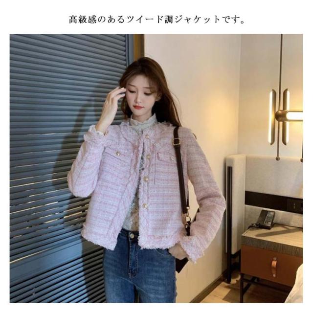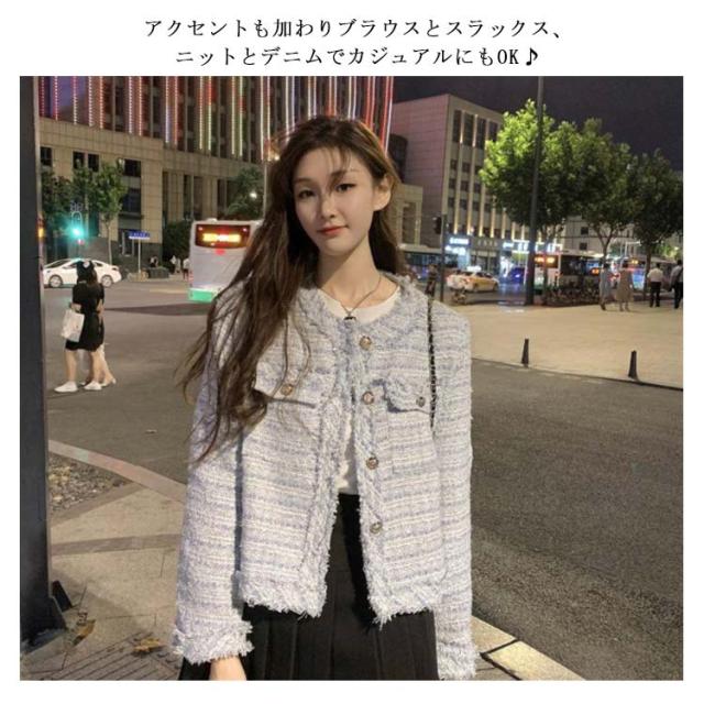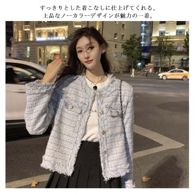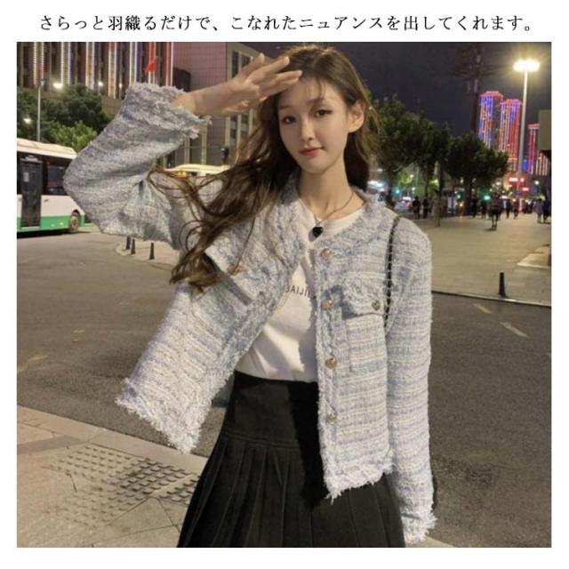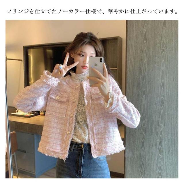 ツイード ジャケット 秋冬 きれいめ フリンジヘム ショート丈 長袖 トップス レディース アウター ノーカラージャケット おしゃれ カジュアル お呼ばれ 韓国ファッション ツイードジャケット 羽織り オケージョン 結婚式 高見え 上品 モード