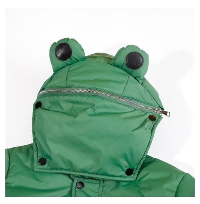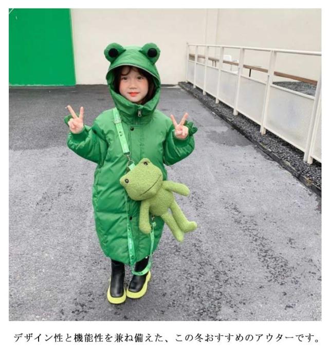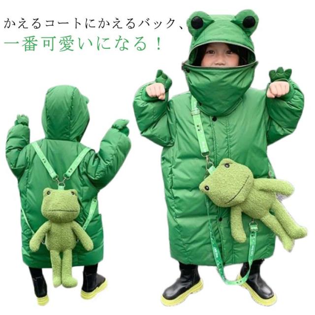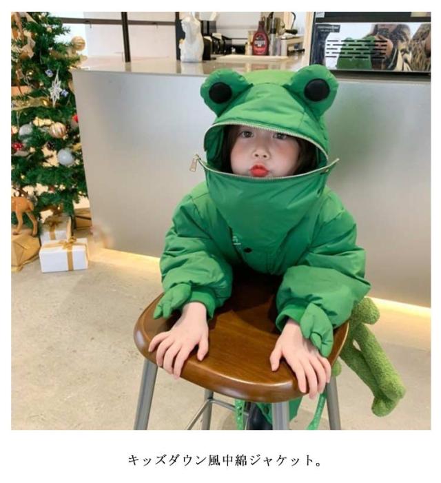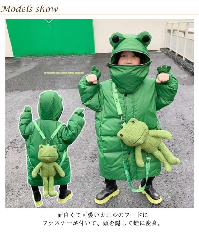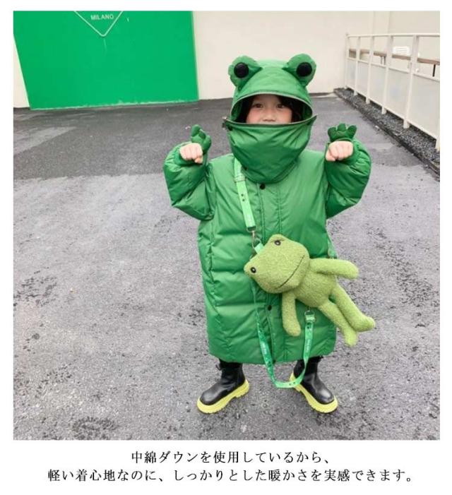 | 面白くて可愛いカエルのフードにファスナーが付いて、頭を隠して蛙に変身。 "かえるコートにかえるバック、一番可愛いになる! キッズダウン風中綿ジャケット。 中綿ダウンを使用しているから、軽い着心地なのに、しっかりとした暖かさを実感できます。 デザイン性と機能性を兼ね備えた、この冬おすすめのアウターです。 | |