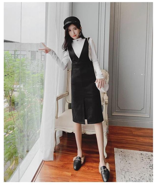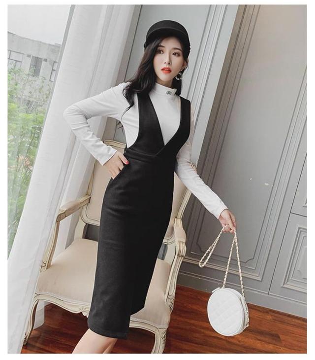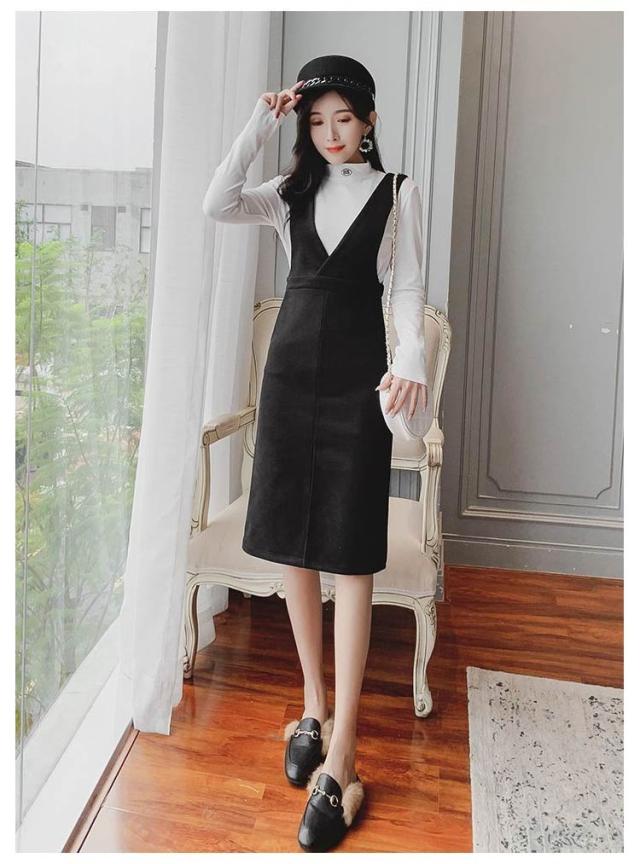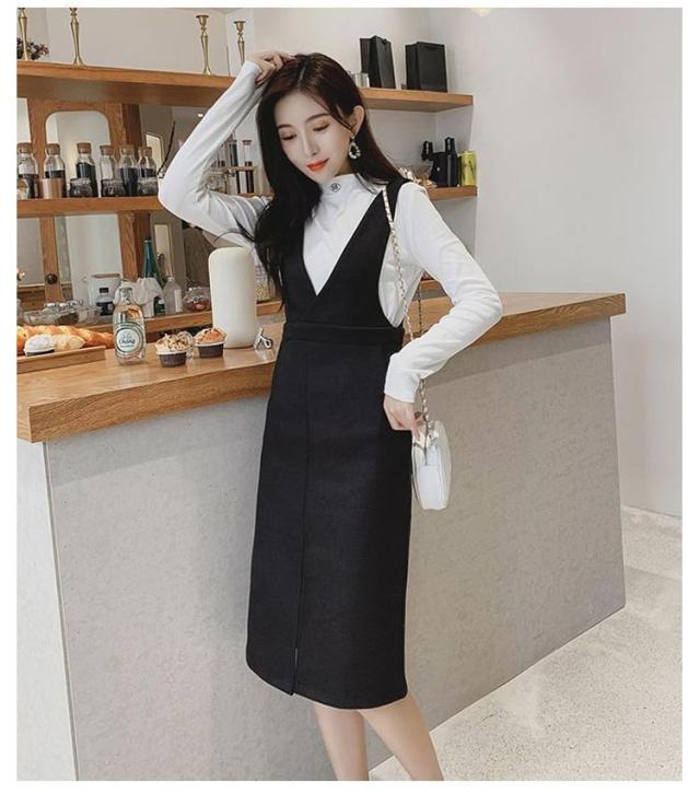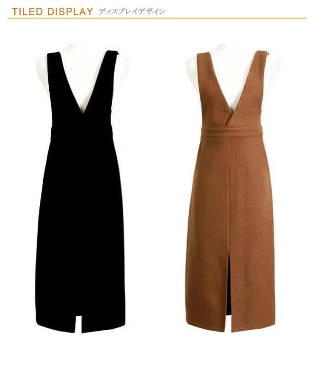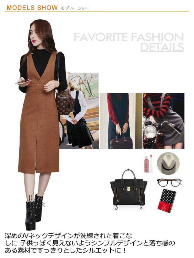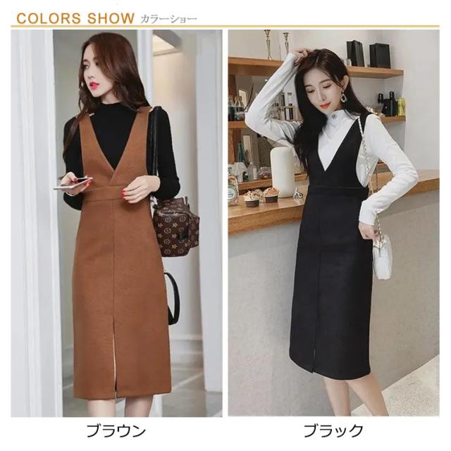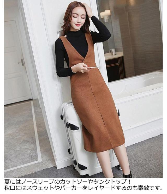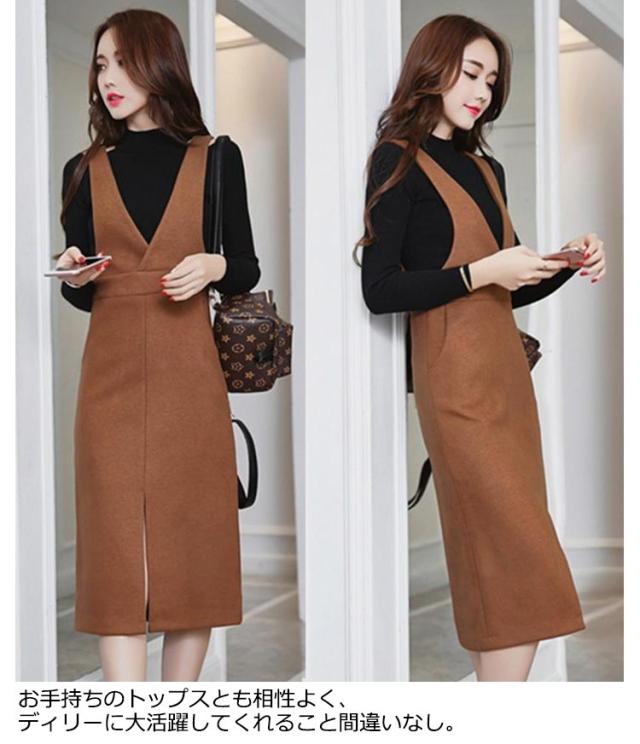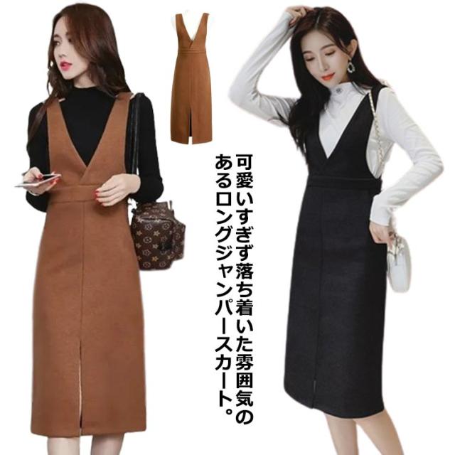 ジャンパースカート ロングワンピース ジャンスカ オールインワン オーバーオール ワンピース Vネック クルーネック Aライン スリット ゆったり 可愛い 大きサイズ 春秋 ブラック 黒 ブラウン 20代 30代 40代 50代 送料無料