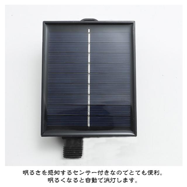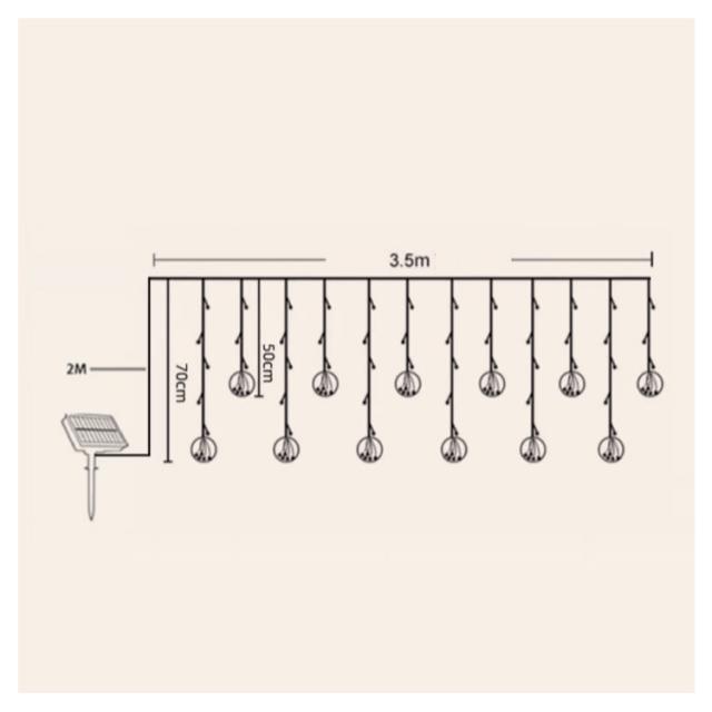 | サイズについての説明 | 【サイズ】全長約5.5m(ソーラーパネルから電球まで2m + 電飾ケーブル3.5m) 【防水等級】 IP65 【充電時間】昼間約6〜8時間(日照不足の場合、USBケーブルで充電可能。)環境により充電時間は変わります。 【点灯時間】約12時間 ※時間は目安で、使用環境により異なります。 【点灯パターン】8パターン |