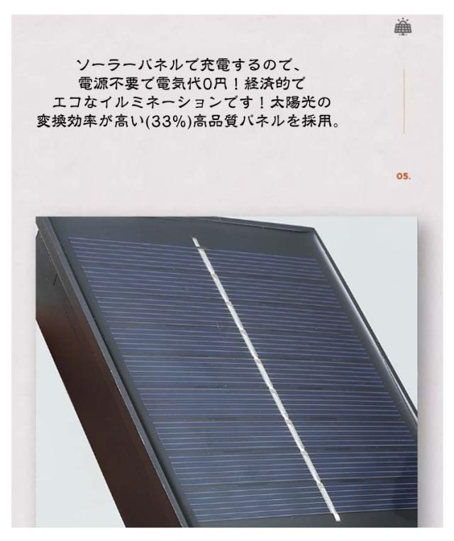 | 【商品名】LEDソーラーイルミネーション 【素材】プラスチック、その他 【サイズ】全長約5.5m(ソーラーパネルから電球まで2m + 電飾ケーブル3.5m) 【防水等級】 IP65 【充電時間】昼間約6〜8時間(日照不足の場合、USBケーブルで充電可能。)環境により充電時間は変わります。 【点灯時間】約12時間 ※時間は目安で、使用環境により異なります。 【点灯パターン】8パターン 【特徴】 LED特有の輝きで飾り付けが一層華やかに盛り上がって、ハッピーな雰囲気を作ります。 ソーラーパネルで充電するので、電源不要で電気代0円!経済的でエコなイルミネーションです!太陽光の変換効率が高い(33%)高品質パネルを採用。 コンセントいらないのでどんな場所でも簡単に設置可能です。 パネルを地面に取り付けて、昼間にソーラーパネルが自動充電し、太陽光を電気に変換します。日照不足の場合、USBケーブルで充電可能です。 明るさを感知するセンサー付きなのでとても便利。明るくなると自動で消灯します。 夜になると、ライトが自動的に点灯します。暖かい光は、ロマンチックで楽しい気分を盛り上げて、家族や友達と素晴らしいクリスマスの雰囲気を楽しめます。 IP65防水タイプなので屋外での使用は可能です。雨の日でも安心してお使いいただけます。 ※ 季節、日照時間、天候、ご使用環境、充電残量、点灯モードなどにより点灯時間や明るさは異なります。 ※冬場の日照不足により、ライトの点灯時間が短くなる場合がございます。予めご了承くださいませ。 ※より長くお使いいただくため、太陽光パネル部分はキレイに保って下さい。 ※ 夜間、周囲が明るくなる場所に設置すると、照度センサーが感知せず点灯しない場合があります。 | |