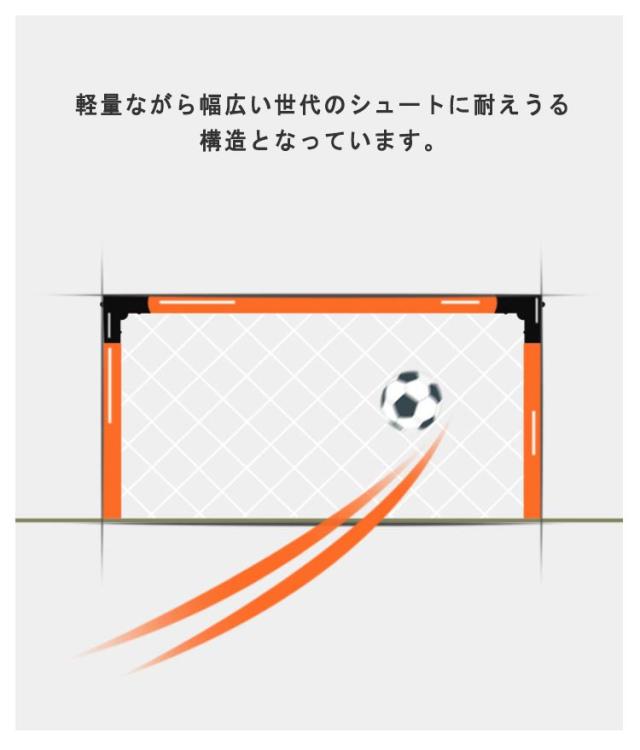 | 室内で、庭先で、公園で。どこでも楽しめる。 ゴールはコンパクトにたためて、持ち運びにも便利です。 キャリーバッグ付で持ち運びも可能。 軽量ながら幅広い世代のシュートに耐えうる構造となっています。 専用のサッカー場などを借りずとも、体育館や運動場などゴールの無い場所でもサッカーが楽しめます。 | |