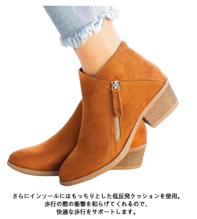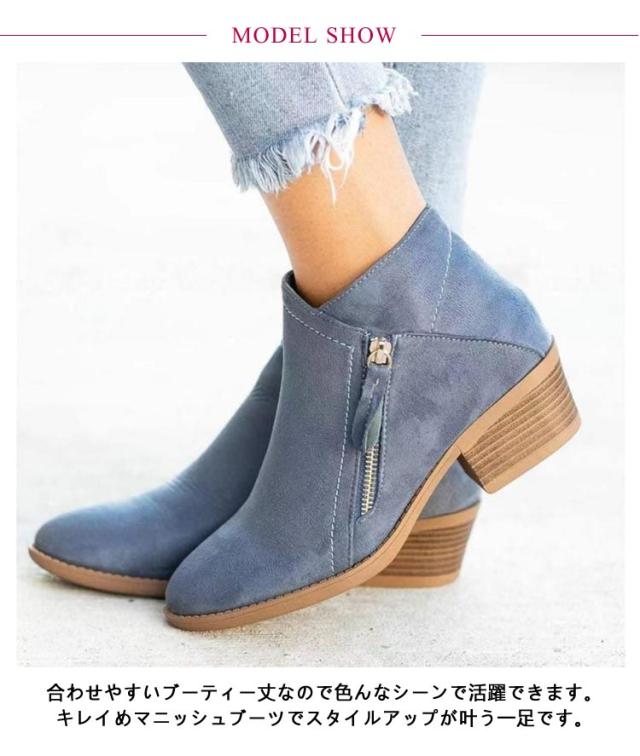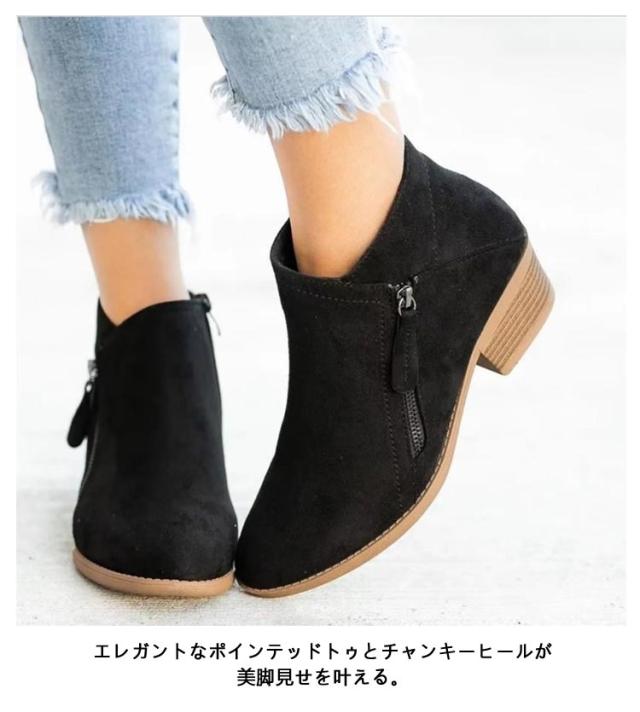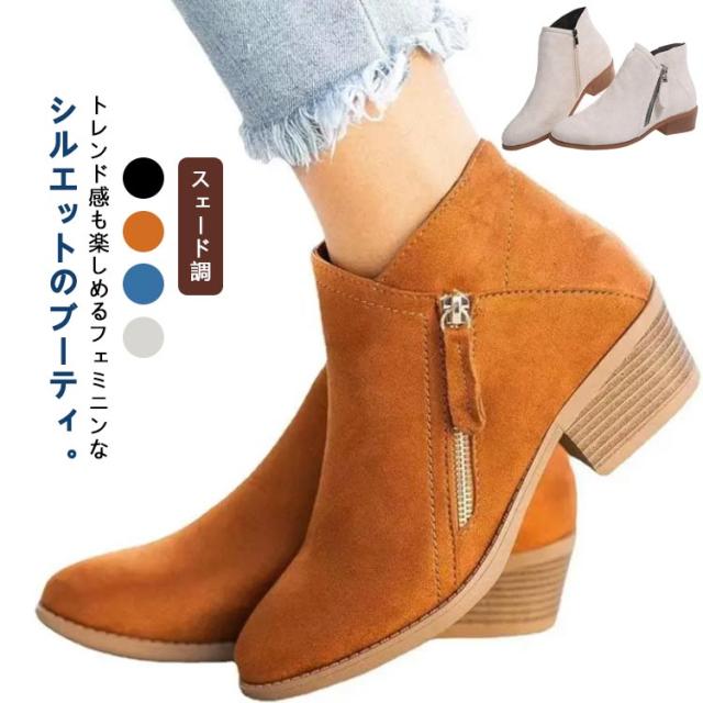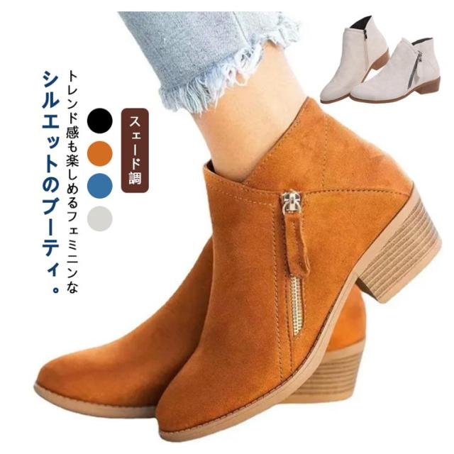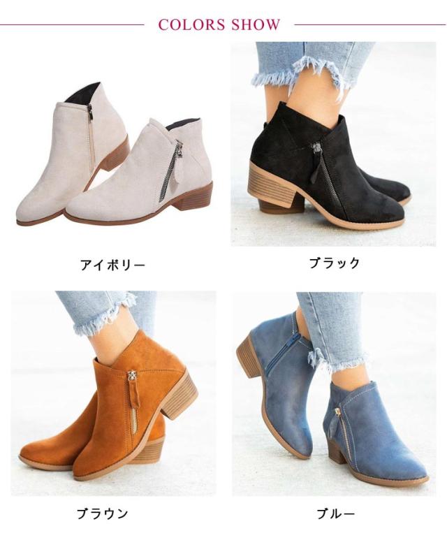 ブーティー ショートブーツ レディース スェード調 太ヒール ジップアップ シンプル ショート ブーツ ブーティ ブーツ 幅広 甲高 ポインテッドトゥ サイドジップ 歩きやすい チャンキーヒール アイボリー ブラック ブラウン ブルー