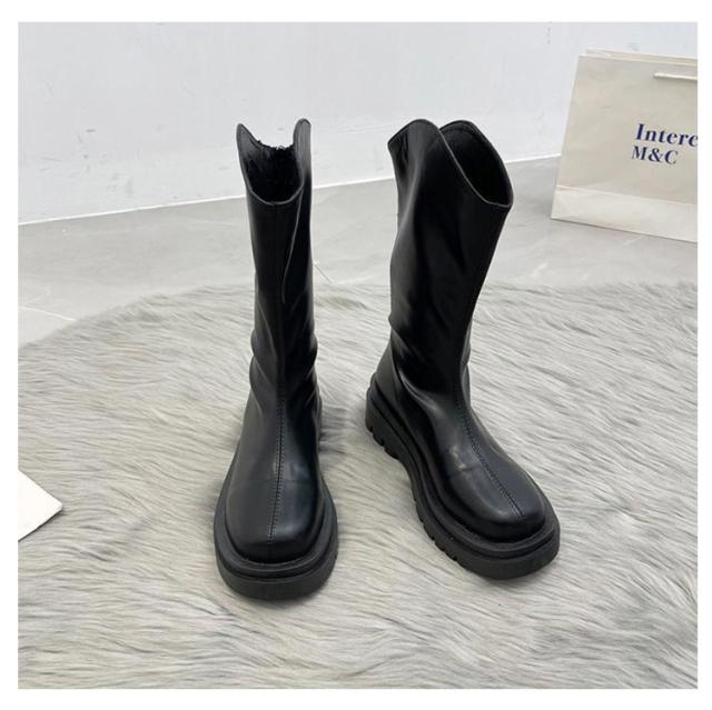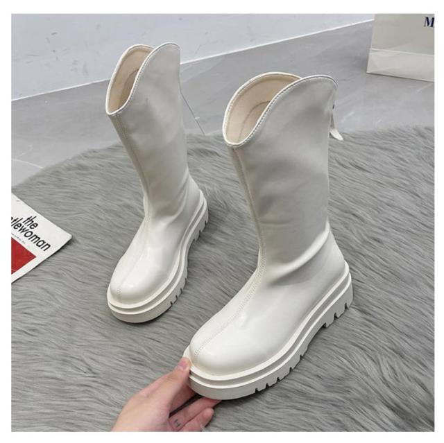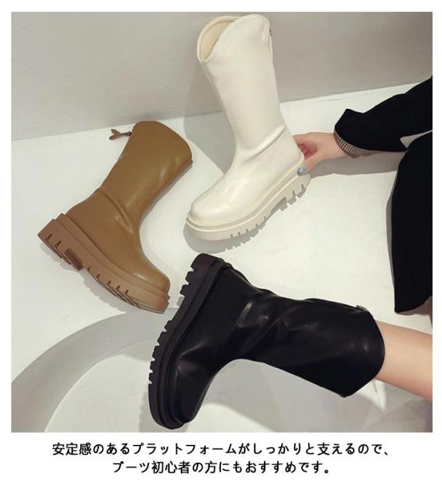 ロングブーツ ジョッキー ブーツ レディース 厚底 ストレッチ ロングブーツ PUレザー ラウンドトゥ プラットフォーム トラックソール バックジップ 疲れない やわらか 柔らかい 歩きやすい 軽量 大きいサイズ 防寒 滑りにくい 美脚