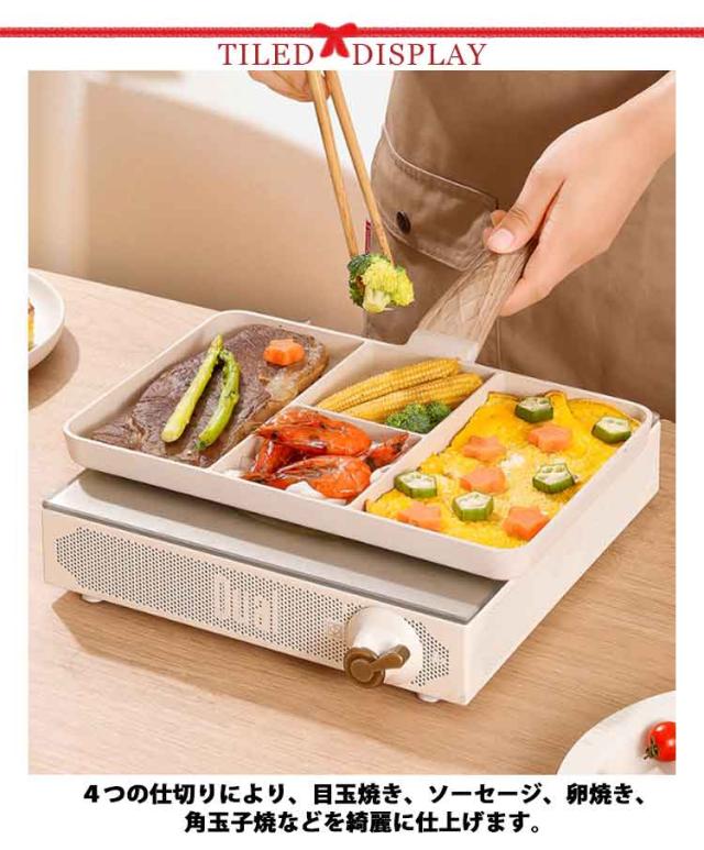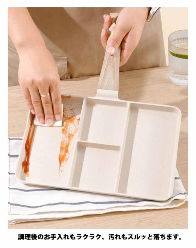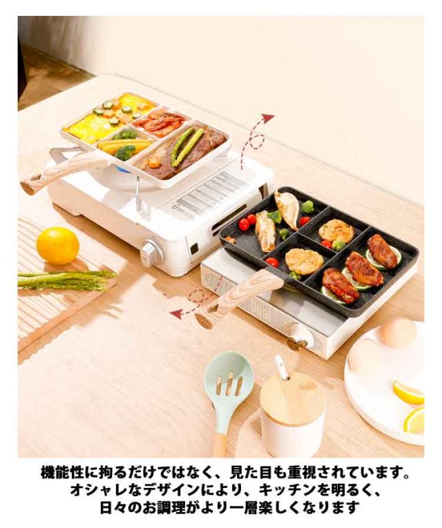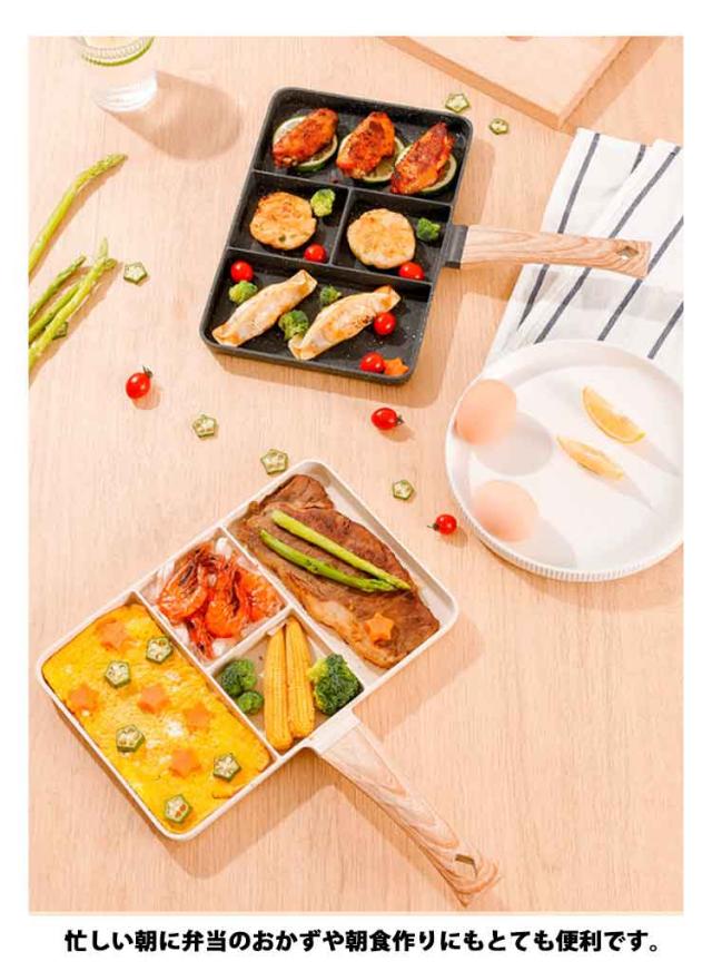 | 【四つ料理同時に作れる】【IH・ガス火対応】 4つの仕切りにより、目玉焼き、ソーセージ、卵焼き、角玉子焼などを綺麗に仕上げます。忙しい朝に弁当のおかずや朝食作りにもとても便利です。 均一に熱伝導鍋体は均一に熱を受けてかまどを選ばない、熱伝導が速くて均一で、各種のガスレンジ及び電磁炉に適します。 持ち手が掛けられる設計で、場所を取らず、省スペースで便利。 マーブルコートをしているため、焦げ付きにくくスムーズに調理できます。調理後のお手入れもラクラク、汚れもスルッと落ちます。 機能性に拘るだけではなく、見た目も重視されています。オシャレなデザインにより、キッチンを明るく、日々のお調理がより一層楽しくなります | |