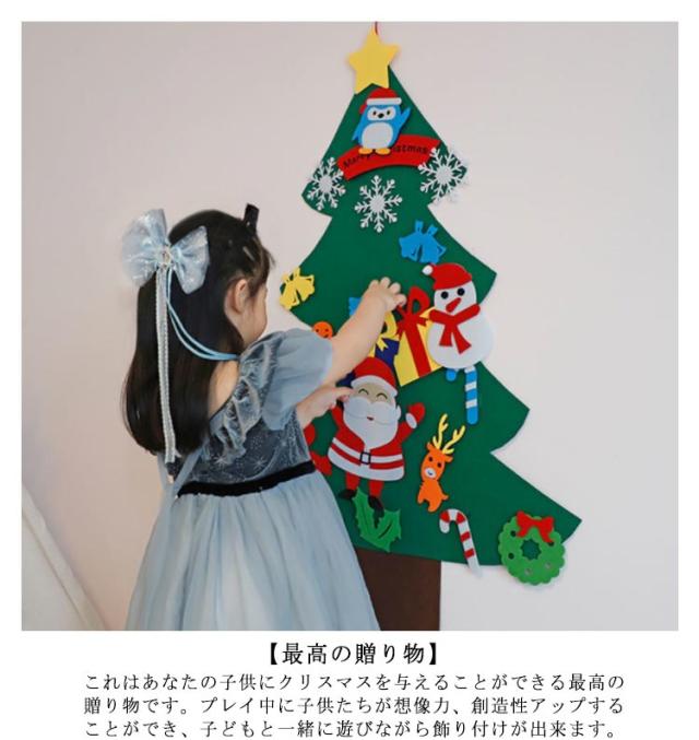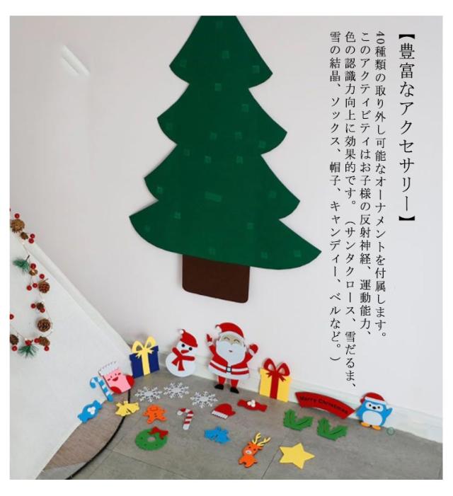 | 【クリスマス雰囲気に】年に一度のクリスマスを特別な一日にしたいなら、お部屋をクリスマス向けのデコレーションが大事です。このフェルトクリスマスツリーがカラフルで、様々の柄のオーナメントが付属して、また、キラキラしているLEDイルミネーションライトがクリスマスツリーの回りを掛けて、クリスマスの雰囲気を盛り上げます! 【軽量・便利にクリスマス気分へ♪】壁掛け式クリスマスツリーです。展開後のサイズ約90*120cm。伝統的なクリスマスツリーに比べて十分軽くて、収納便利で、省スペースです。 【豊富なアクセサリー】40種類の取り外し可能なオーナメントを付属します。このアクティビティはお子様の反射神経、運動能力、色の認識力向上に効果的です。(サンタクロース、雪だるま、雪の結晶、ソックス、帽子、キャンディー、ベルなど。) 【最高の贈り物】これはあなたの子供にクリスマスを与えることができる最高の贈り物です。プレイ中に子供たちが想像力、創造性アップすることができ、子どもと一緒に遊びながら飾り付けが出来ます。 【様々な場所で活躍】このDIYクリスマスツリーは家・学校・喫茶店・店舗など様々な場所で簡単に飾ります。クリスマス飾り:幼稚園、子供の部屋、リビングルーム、スーパーマーケット、店舗、ホテルなどにクリスマス雰囲気演出するに最適です。 | |