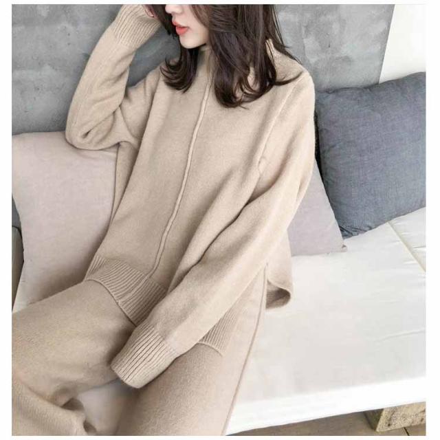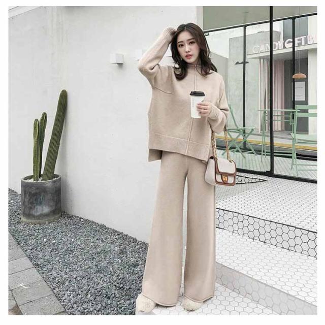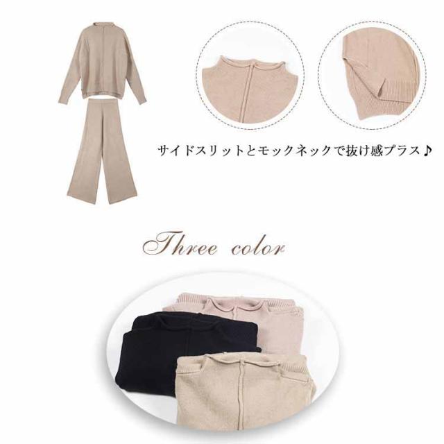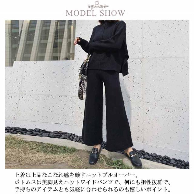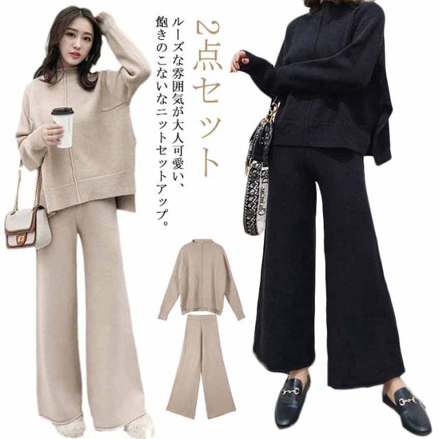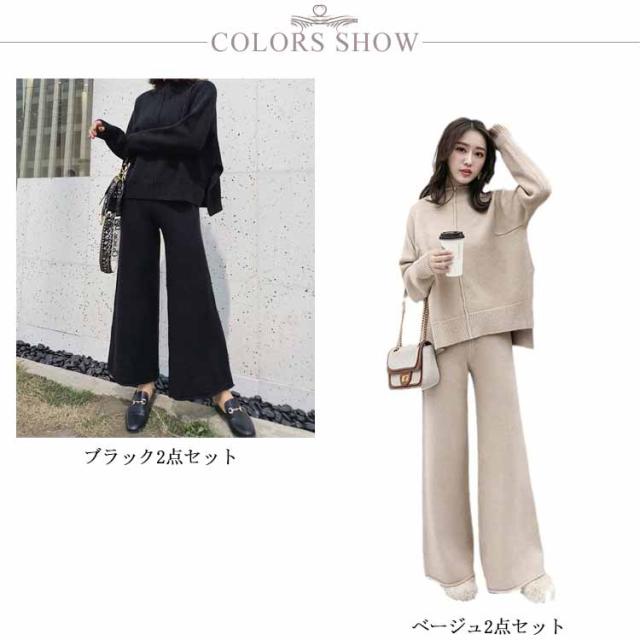 [S~2XL] 上下セット ニットセットアップ レディース セットアップ 秋冬 長袖 リブ ニット セーター プルオーバー ハイネック モックネック トップス ロング パンツ ワイドパンツ お出かけ 通勤 無地 ゆったり