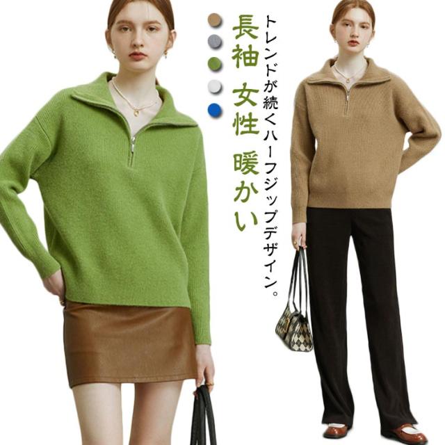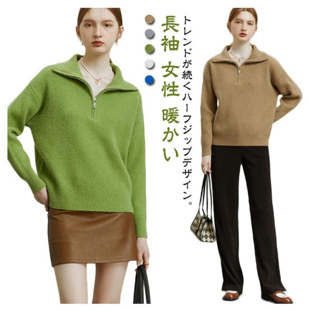 ニット ハイネック プルオーバー シンプル ハーフジップ フリーサイズ もちもち ハーフジップトップス レディース トップス 軽い 軽量 切り替え 長袖 女性 暖かい シンプル カジュアル 秋 冬 韓国ファッション おしゃれ 通勤 きれいめ 無地
