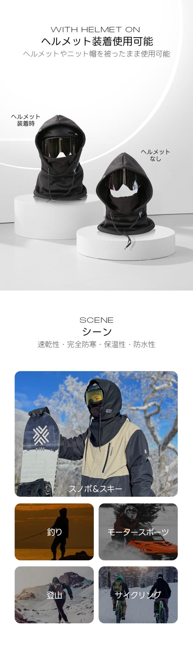 雪で反射した紫外線から頭や首回りをしっかり守ります、ニット帽やキャップの着用はもちろん、ヘルメット着用のままでも使用できます。