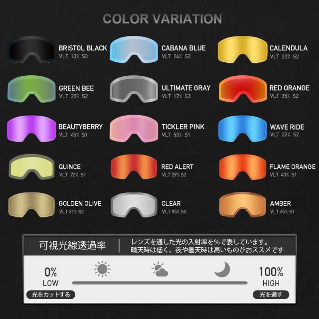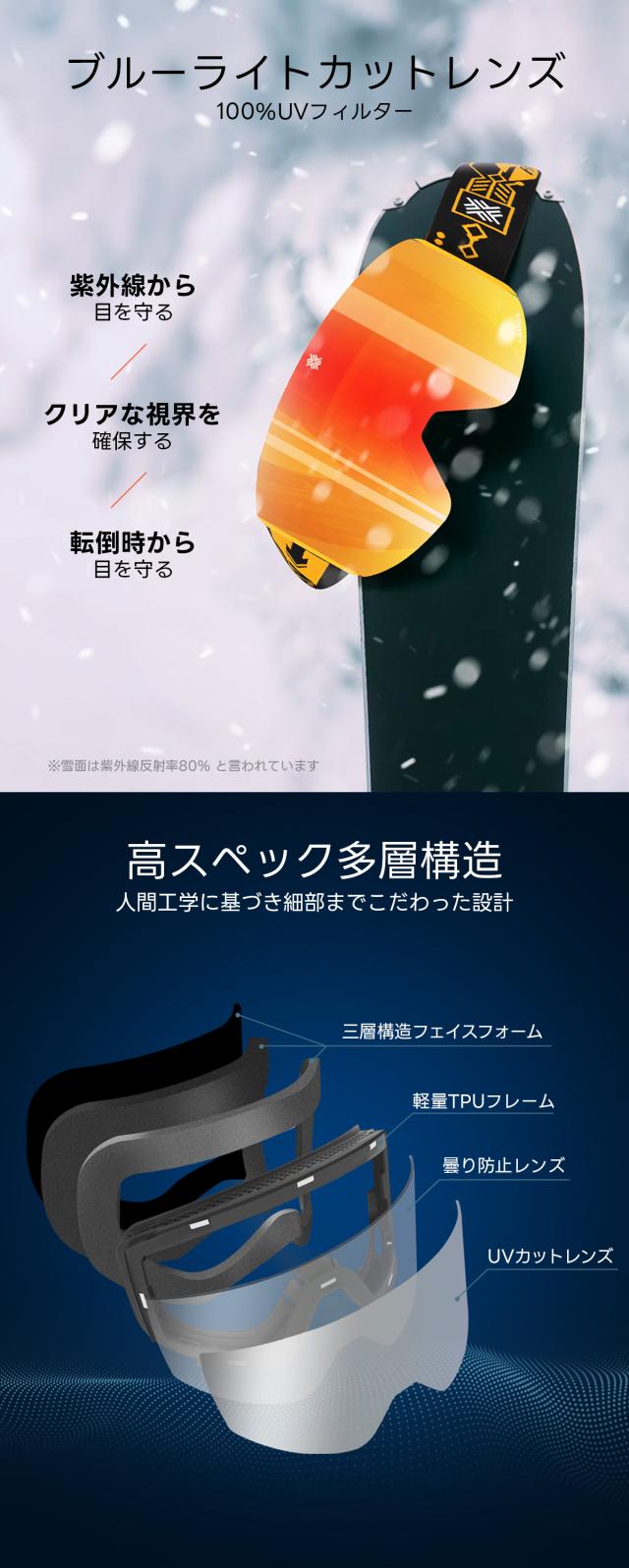 WVAレンズテクノロジーにより色彩を鮮明に再現し、自然な色味のままコントラストを強化。地形の凹凸をくっきりと認識できます。UV光線は100%カットし、有害なブルーライトも最大400nmまで防御。空気層を挟んだ二層構造レンズが外気の冷えを遮断し、内側の結露を抑えて曇りを防止します。