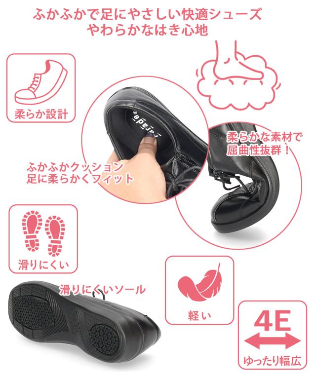 | やわらかな はき心地の コンフォートシューズ 柔らか設計;足になじみやすい柔らか素材、柔らかくフィットするふかふかクッション。軽い。ゆったり幅広設計 4E。滑りにくい設計のソール 。 足に嬉しい機能が充実!快適な歩行をサポートします。外側にファスナーが付いているので、脱ぎ履きも容易に行えます。 |