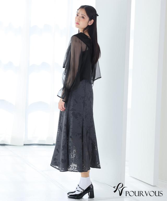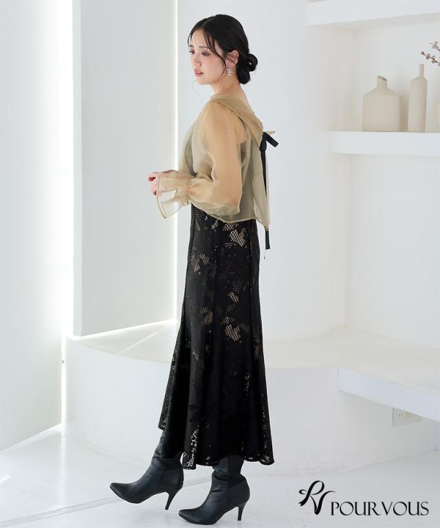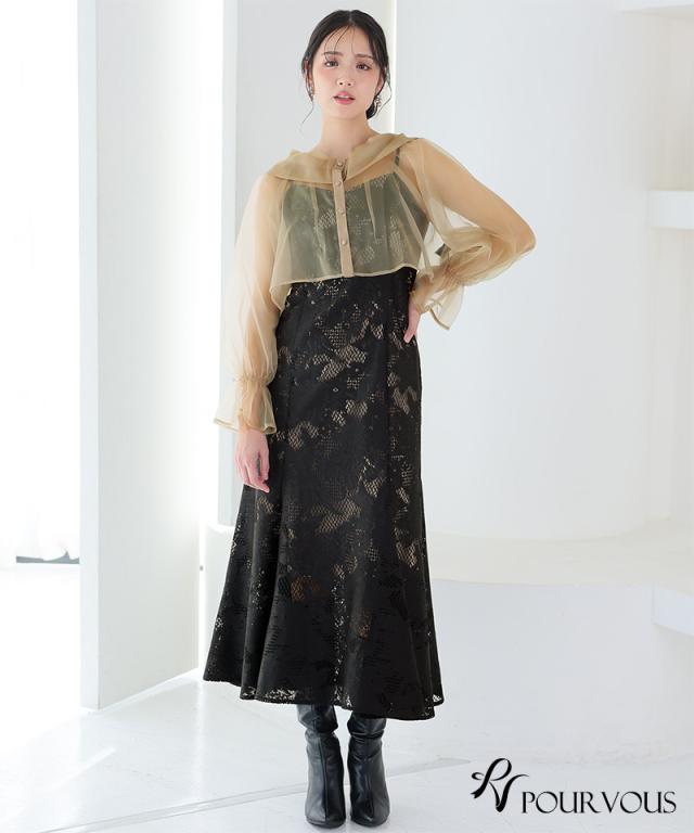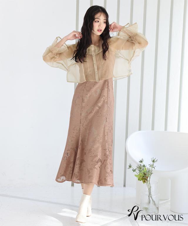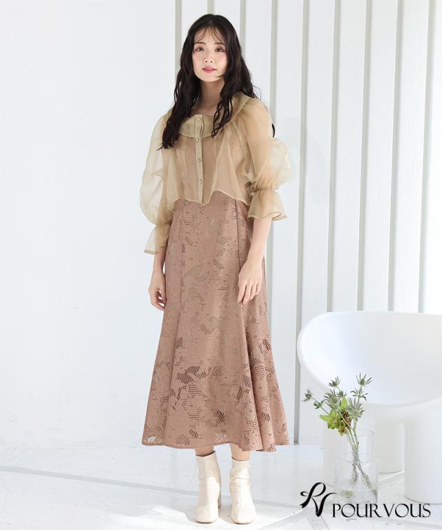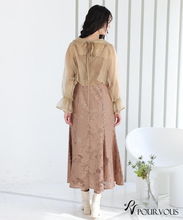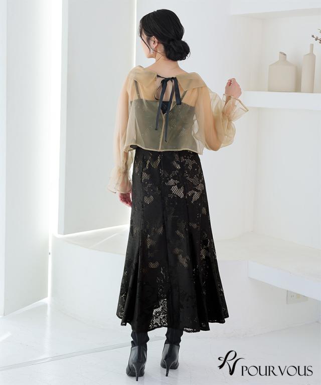 シアーなブラウスと大人っぽいレースキャミワンピのセットドレス。ふんわりと動きのあるブラウスでフェミニンな印象に。大人っぽいレースワンピースで甘くなりすぎず、オトナ女子にもおすすめです。ブラウスは前後を逆にして着用したり、ボタンを開けてボレロの様に着用しても◎