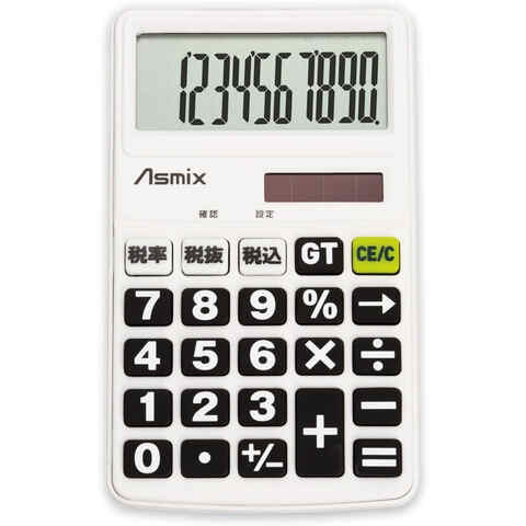 ストア内の商品は全品送料無料です。フラットタイプの10桁電卓です。〔機能一覧〕・税計算(税込・税抜)・税率設定・桁下げ(→)キー・早打ち対応・%キー・オートパワーオフ機能・GT機能【使用電源】太陽電池+ボタン電池(L1131)1個【材質】ABS【保証期間】1年間【付属品】取扱説明書、保証書【サイズ】(W×D×H):70×120×9mm【質量】52g【カラー】ホワイト■メーカー: アスカ
