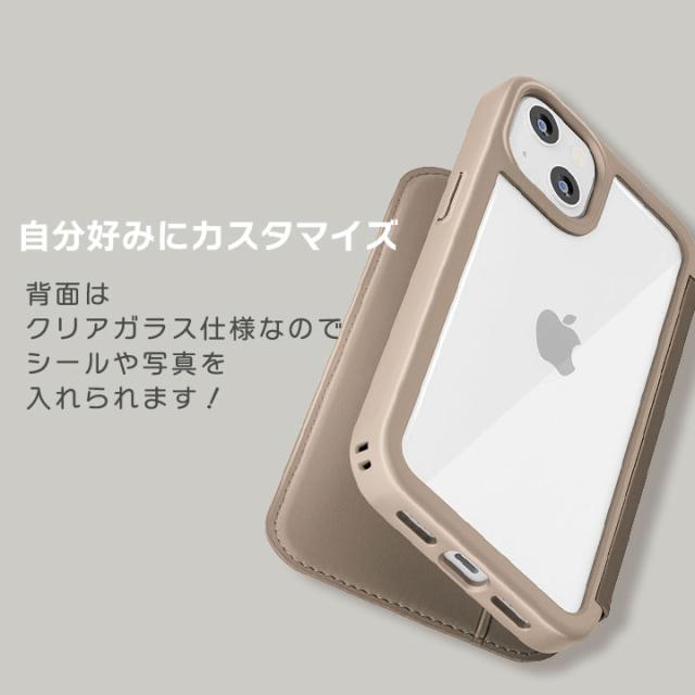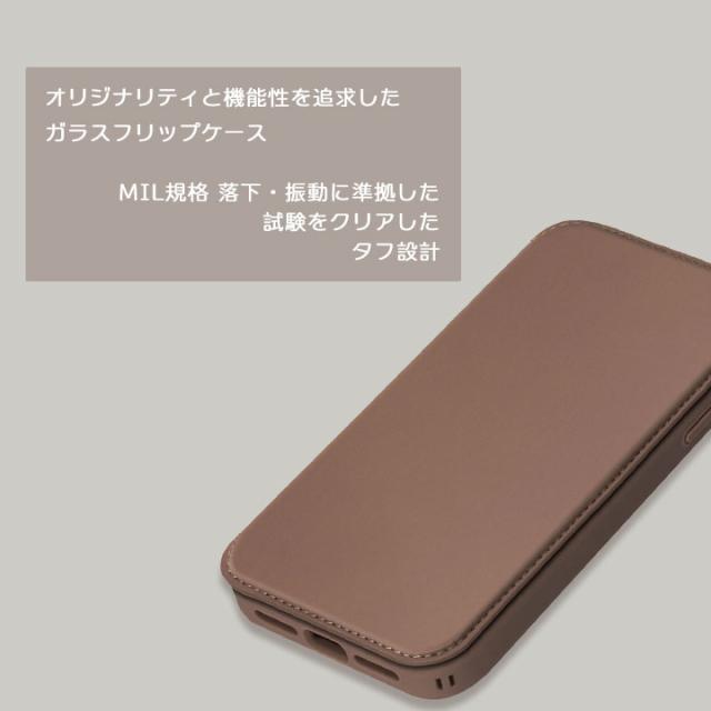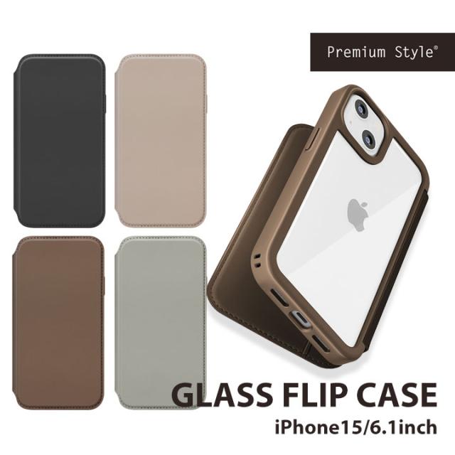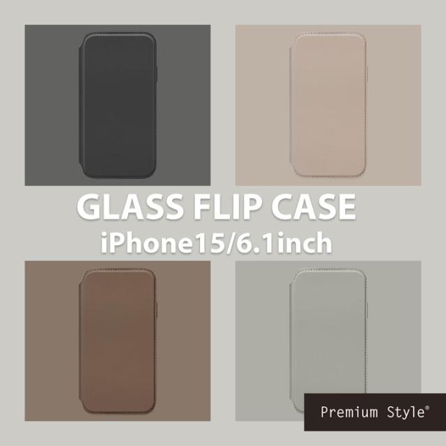 iPhone15 6.1inch ガラスフリップケース ブラック ベージュ ブラウン グレー 手帳型ケース 背面9H強化ガラス ストラップホール付 カードポケット マグネットロック メール便送料無料