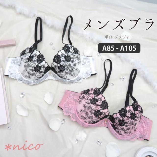 ノスタルジックなフラワー刺繍レースのブラックがアクセントのブラ。カップ下にはフラワーレースをほどこし華やかさUP。実際につけてみたい、初めてのメンズブラに挑戦したい、そんな方におすすめ。カップの丸みが分かりにくく、ストラップも長めの設計で体にフィットします。お揃いのショーツもお見逃しなく。