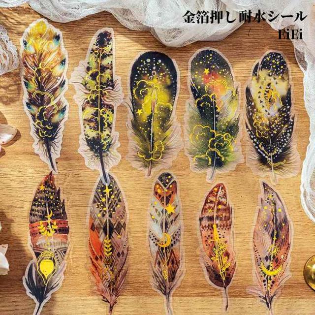 金箔押し クリアシール 羽 羽根 大きめ フェザー カラフル フレークシール コラージュ 素材 海外ステッカー 手帳 日記 アルバム スマホカバー 飾り 手芸 ハンドメイド 資材 素材 箔押し 透明 耐水 防水 ステッカー 10枚 デコレーション素材 ジャンクジャーナル DIY