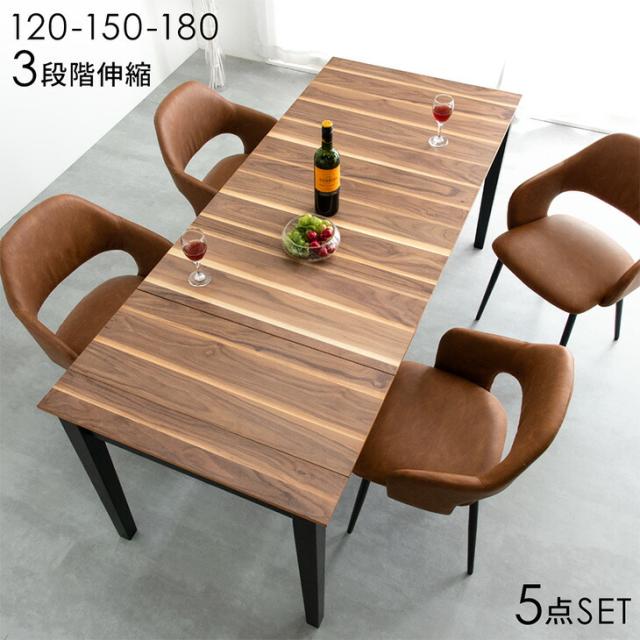 3段階伸長 ダイニングセット 120 150 180 4人 ダイニングテーブル エクステンション テーブル 食卓 ダイニングテーブルセット 4人掛け 伸長式 伸縮 伸長 大きめ 木目 ダイニングチェア ダイニング セット 5点セット おしゃれ