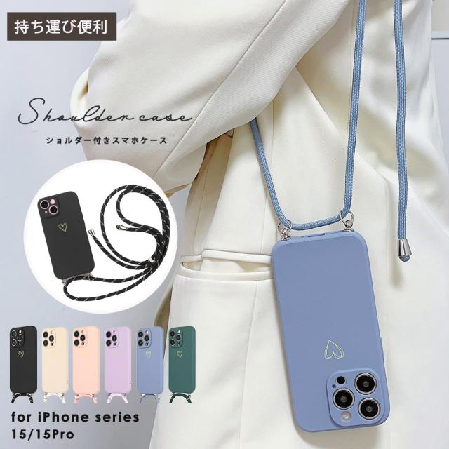 iPhone15 ケース iPhone15 Pro ケース スマホケース ネックストラップ 2点セット 衝撃 TPU マット カメラ保護 フルカバー 黒 ハート シンプル ショルダーケース シェル スマホショルダー 斜め掛け 肩掛け 紐 ひも 長さ 調節可能 落下防止 ストラップホール アイホン