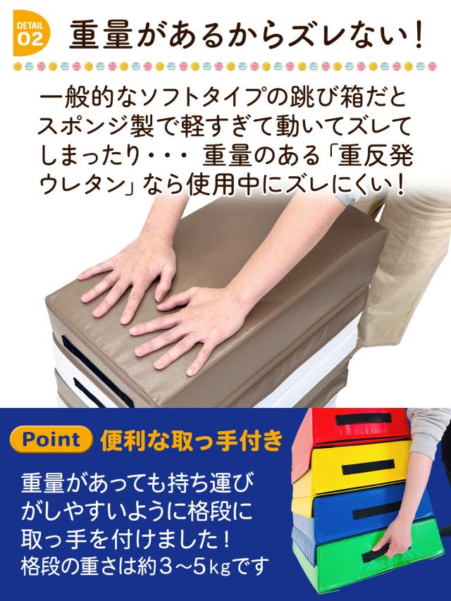 【ズレない跳び箱を作るために重反発ウレタン採用】一般的なソフトタイプの跳び箱は「飛ぶときに動いてしまう」という問題を抱えていました。そこで商標登録済みのオリジナル素材「重反発ウレタン」を採用しました!重量がありつつ、クッション性がしっかりとある重反発ウレタンは跳び箱の素材としてピッタリで、思いっきり飛んでもズレにくい跳び箱が完成しました。