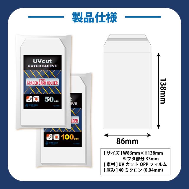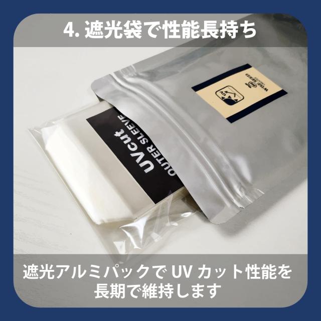 スリーブはトレーディングカードの大敵である日焼け・色あせを防止するUVカットフィルムを使用しております。紙やインクの劣化を招く紫外線領域の約80%をカットする素材を使用し、長くきれいに保管・鑑賞できるスリーブを作りました。