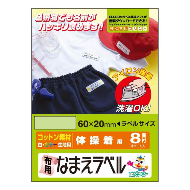 体操着に最適!アイロンで簡単に貼り付けられる“布用なまえラベル"。綿100%素材でやわらかな風合いに仕上がります。<br>◆商品名:エレコム アイロンプリントペーパー はがきサイズ 3枚入り 8面 白/濃い生地用 体操着用 EJP-CTPL3<br>■用紙サイズ:幅100mm×高さ148mm(はがきサイズ) ■一面サイズ:幅20mm×高さ60mm ■ラベル枚数:24枚(8面×3シート) ■素材タイプ:コットン素材(コットン100%) ■カラー:ホワイト ■紙厚:0.32mm ■坪量:160g/m2 ■テストプリント用紙:テストプリント用紙1枚(取扱説明書内に付属) ■お探しNo.:P34 ■セット内容:コットンラベル×3、取扱説明書、テストプリント用紙×1(取扱説明書内に付属)