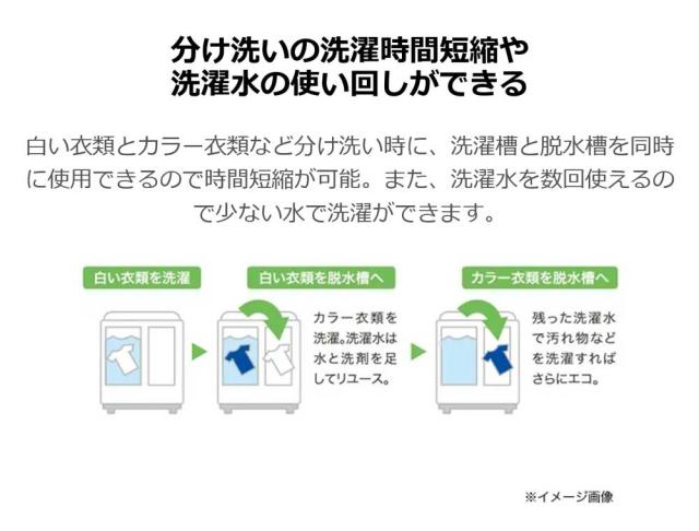 白い衣類とカラー衣類など分け洗い時に、洗濯槽と脱水槽を同時に使用できるので時間短縮が可能。