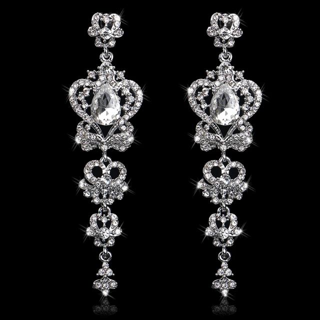 ハートと王冠をモチーフにしたキュービックジルコニアが揺れるロングタイプのキャッチピアス。
