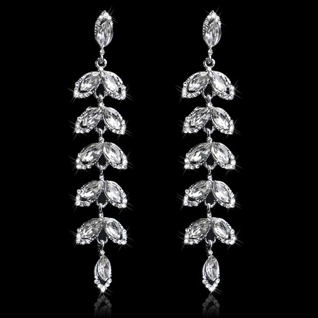 ロングリーフ クリスタルウエディングジュエリーピアス 1ペア シルバー キャッチピアス ポスト 新婦 結婚式 披露宴 花嫁 揺れる ジルコニア ラインストーン レディース 20G 20ゲージ パーティー 女 ドレス 舞台 ブライダル プリンセス 流線形 長い 葉