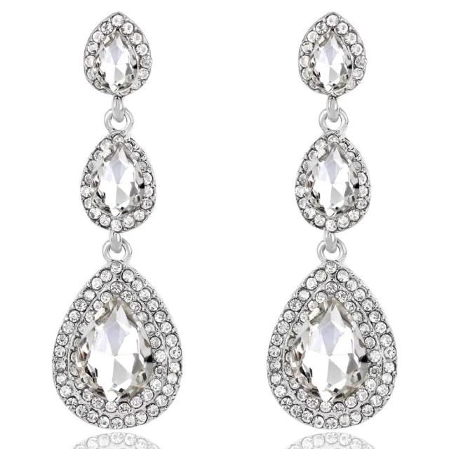 トリプルティアドロップ クリスタルウエディングジュエリーピアス 1ペア シルバー キャッチピアス ポスト 新婦 結婚式 お披露目 花嫁 揺れる ジルコニア ラインストーン レディース 20G 20ゲージ パーティー 女 ドレス ブライダル プリンセス 3個 涙 滴 雫 ティアードロップ