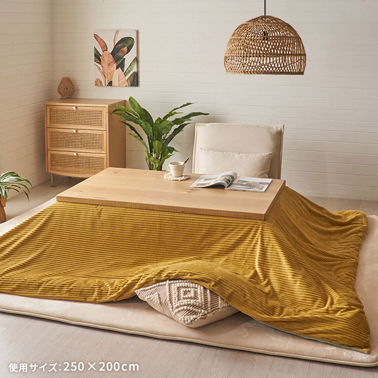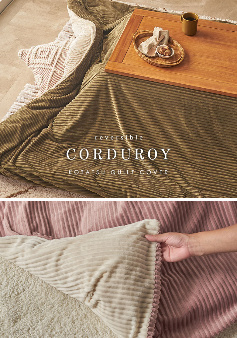 両面コーデュロイで、リバーシブルで使えるこたつ布団カバー。お手持ちのこたつ布団(240×190cm程度のこたつ布団)を入れてお使いいただけます。インテリアやテーブルの天板に合わせて好きな色を表にして、お部屋の雰囲気を簡単チェンジ。