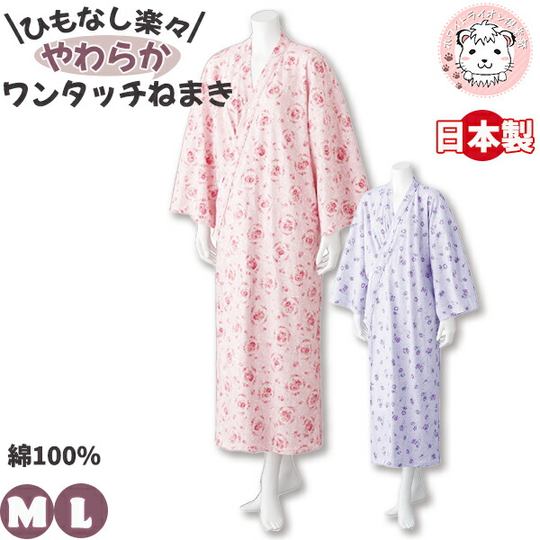 ヒモなし楽々 やわらかワンタッチねまき パジャマ 寝間着 M/L | レディース 前開き 介護パジャマ 全開パジャマ かわいい 日本製 ナイトウェア ルームウェア