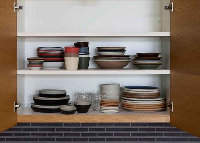高台がなくフラットな形状なので、サイズ違いを重ねてもスペースを圧迫せず、食器棚にすっきり収納できます。