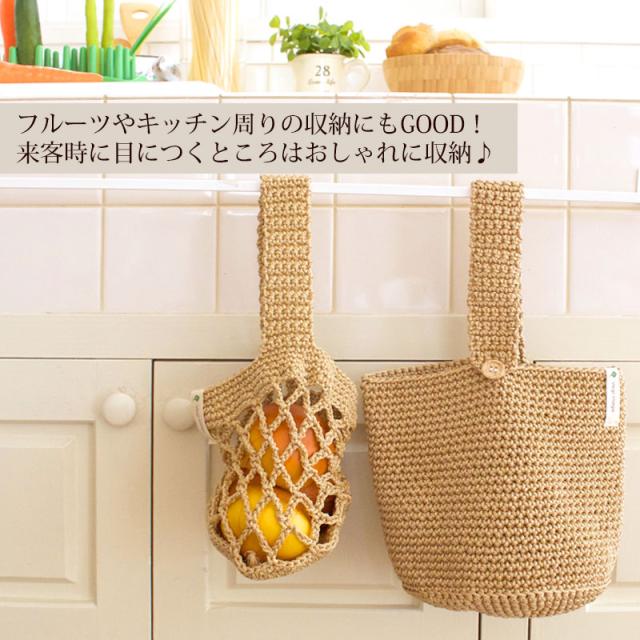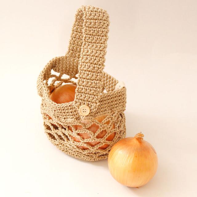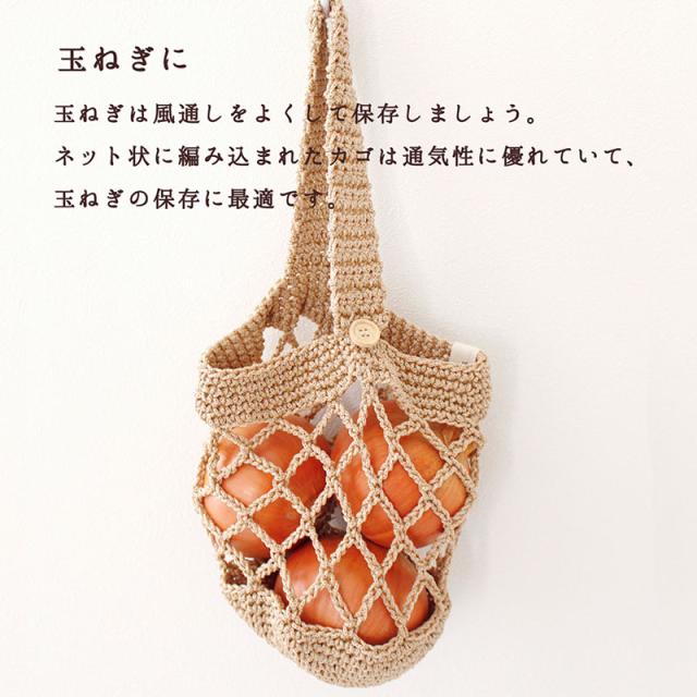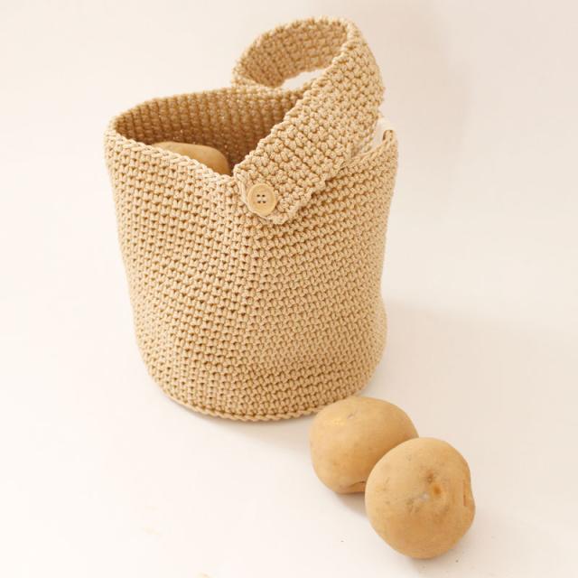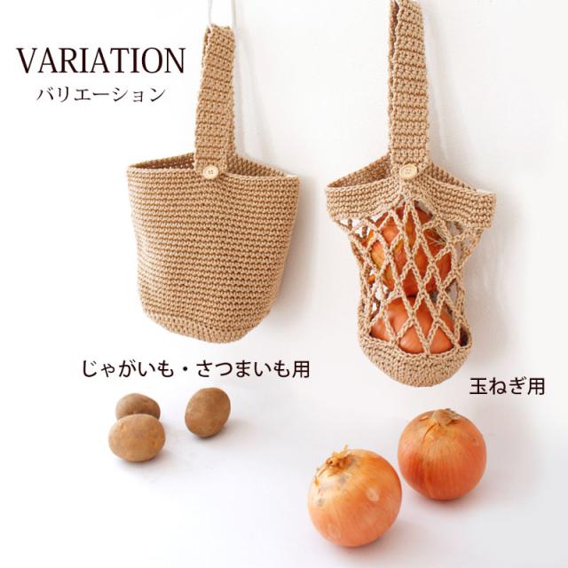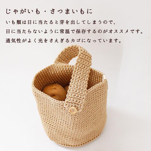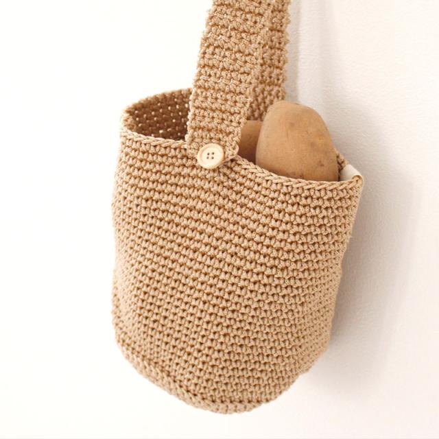 | ご使用上のご注意 | ・吊るす時、じゃがいもの場合はMサイズ9〜10個(約1.5kg)、さつまいもの場合はMサイズ4〜5本(約1.5kg)を目安にしてください。(重すぎるとボタンの破損や生地が損傷する恐れがあります。) ・中身を入れて吊るした状態でボタンを外さないようにしてください。ボタンに力が加わり破損する恐れがあります。 ・糸を引っぱったり、引っかけたりしないでください。(糸がほどけた場合は、つくろってください。) 手編み商品の為、仕上がりサイズに違いが生じる場合があります。 ・生地の特性上使用しているうちに伸縮する場合があります。 ・この商品はじゃがいも・さつまいも用に作られたものです。 |