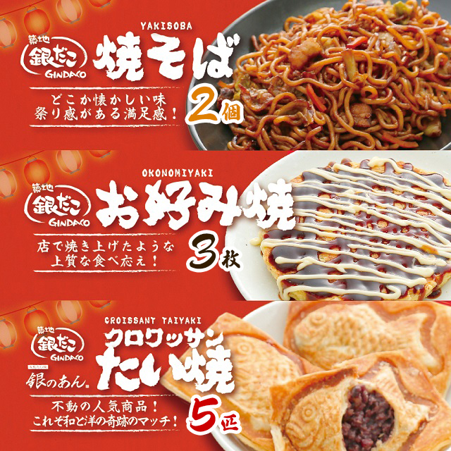 送料込み 築地銀だこ バラエティセット もちチーズお好み焼×3枚、焼そば×2個、クロワッサンたい焼×5匹 冷凍 築地 銀だこ 詰め合わせ たいやき 餅 アソート セット 銀のあん 餅 チーズ クロワッサン お好み焼 焼きそば ソース 冷凍食品 焼きそば