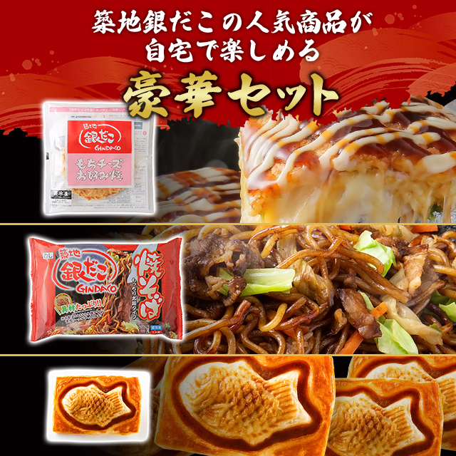 商品名 築地銀だこ バラエティセット もちチーズお好み焼×3枚、焼そば×2個、クロワッサンたい焼×5匹 容量 ・築地銀だこ もちチーズお好み焼 600g(200g×3枚)