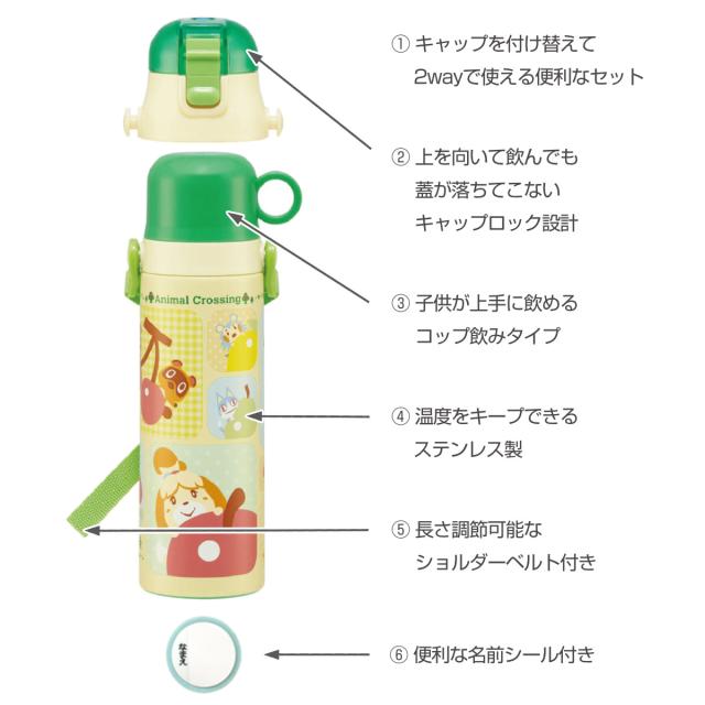 水筒 580ml 超軽量2WAYステンボトル どうぶつの森21 ( どうぶつの森 2way 直飲み コップ ステンレス 保温 保冷 ワンプッシュ ボトル コップ飲み 子供 子供用水筒 直のみ ワンタッチ 超軽量 幼稚園 保育園 ネームプレート付き )