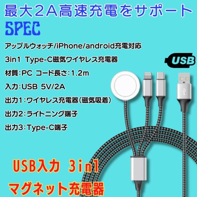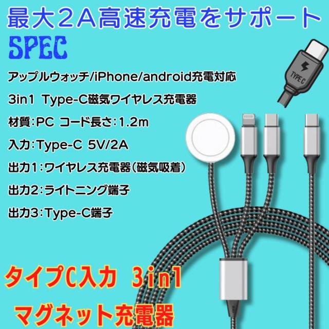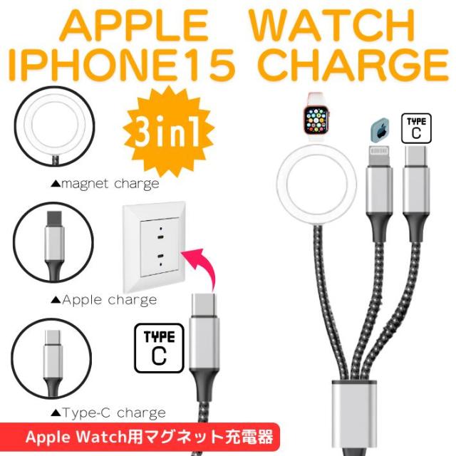 アップルウォッチ 充電器 iphone 15 充電ケーブル タイプc Type-c 高耐久 3in1 apple watch 充電器 series9 対応 アップルウォッチ充電器 高速充電 1 2 3 4 5 6 7 8 9 ultra ultra2 se2 se 対応 5V 2A ※ アダプタ アダプター 充電スタンド 純正 ではありません【商品説明】