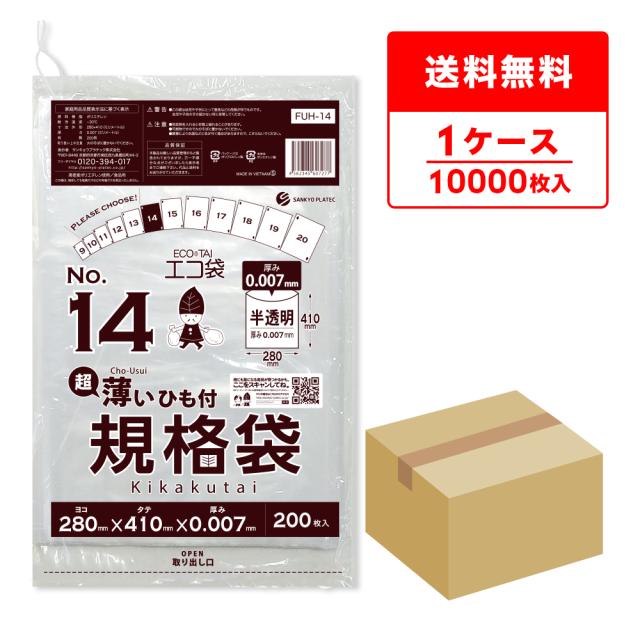 ひも付 規格袋 14号 薄手 半透明 28x41cm 0.007mm厚 200枚x50冊 FUH-14 /ポリ袋 袋 平袋 保存袋 食品袋 食品検査適合 RoHS指定